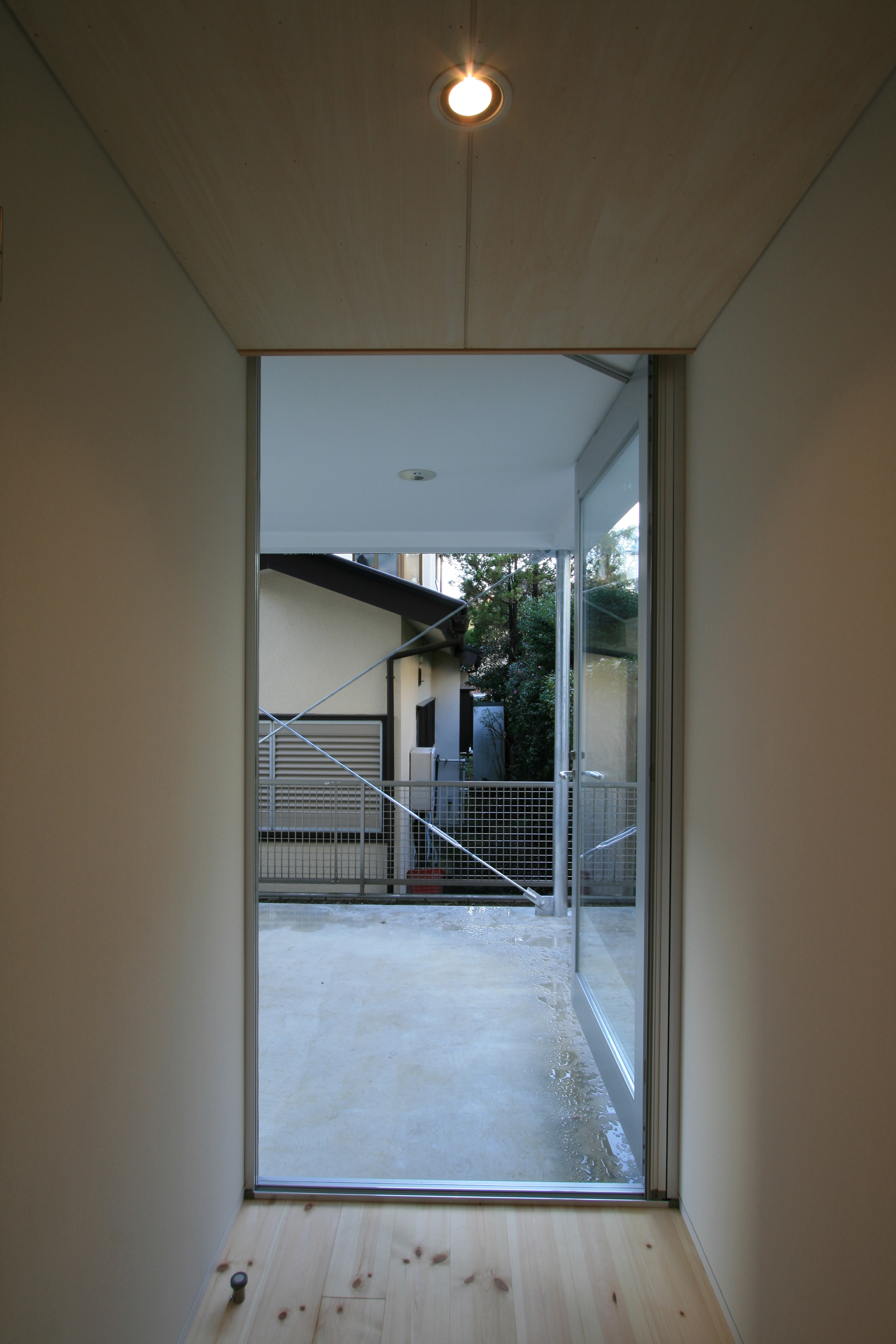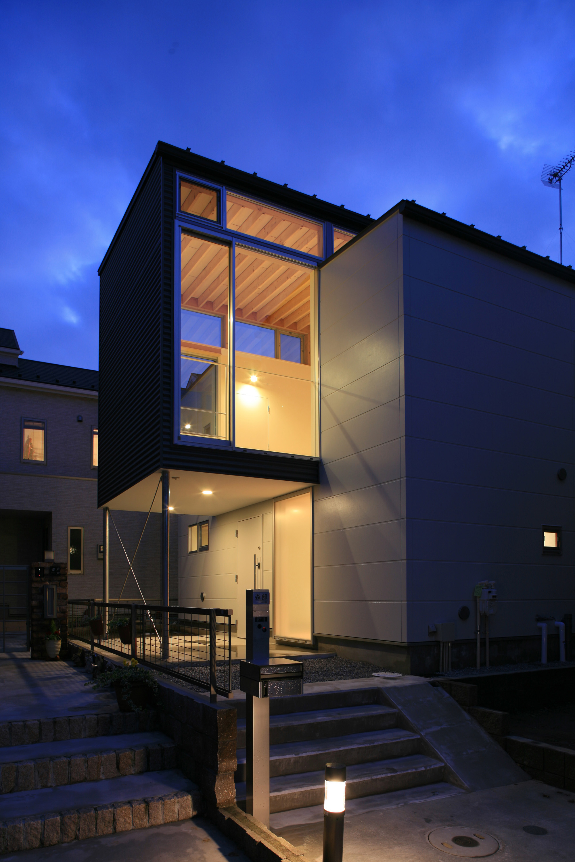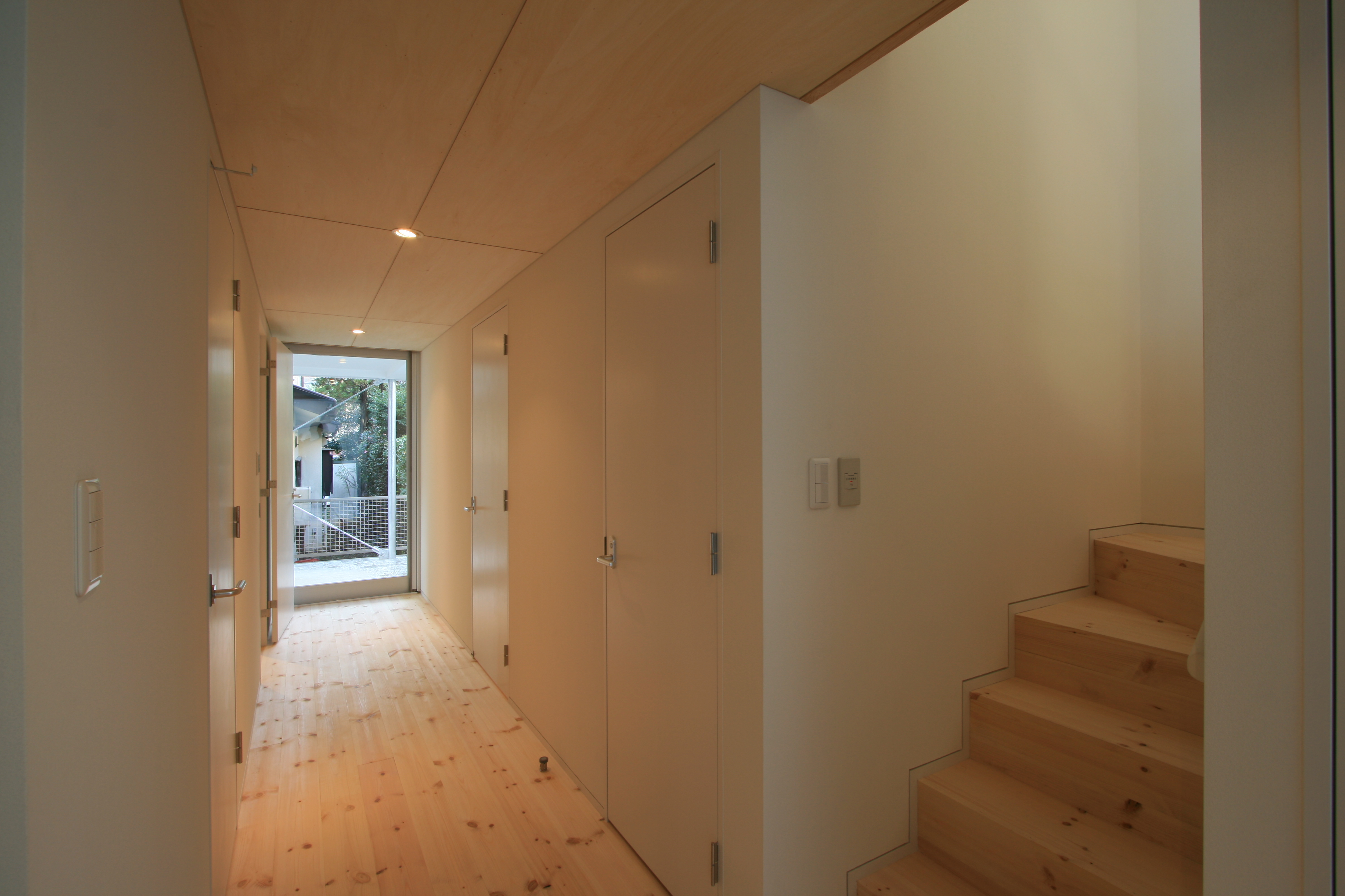 分譲地の中ほどにある旗竿敷地に建つ夫婦と子供1人のための住宅です。