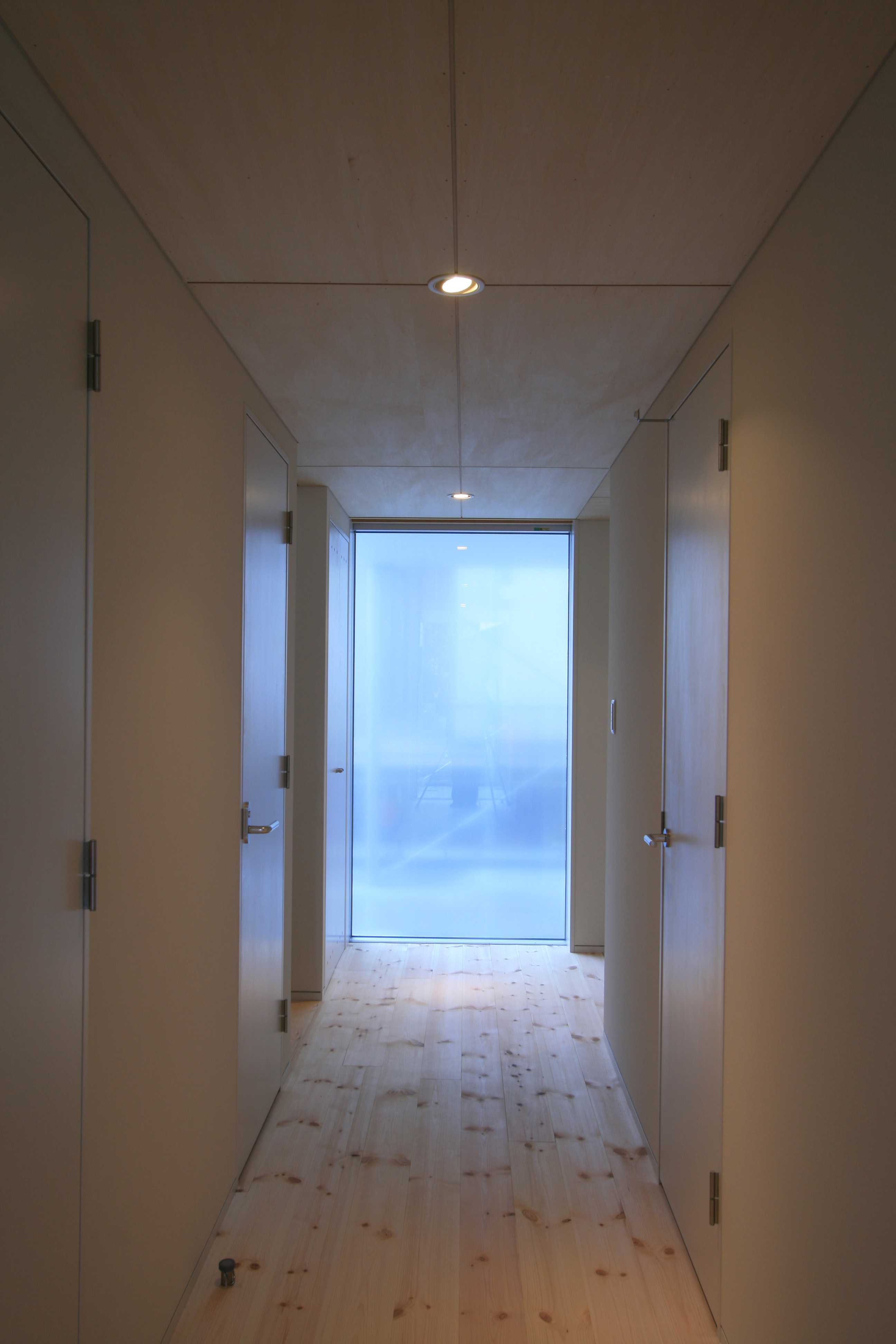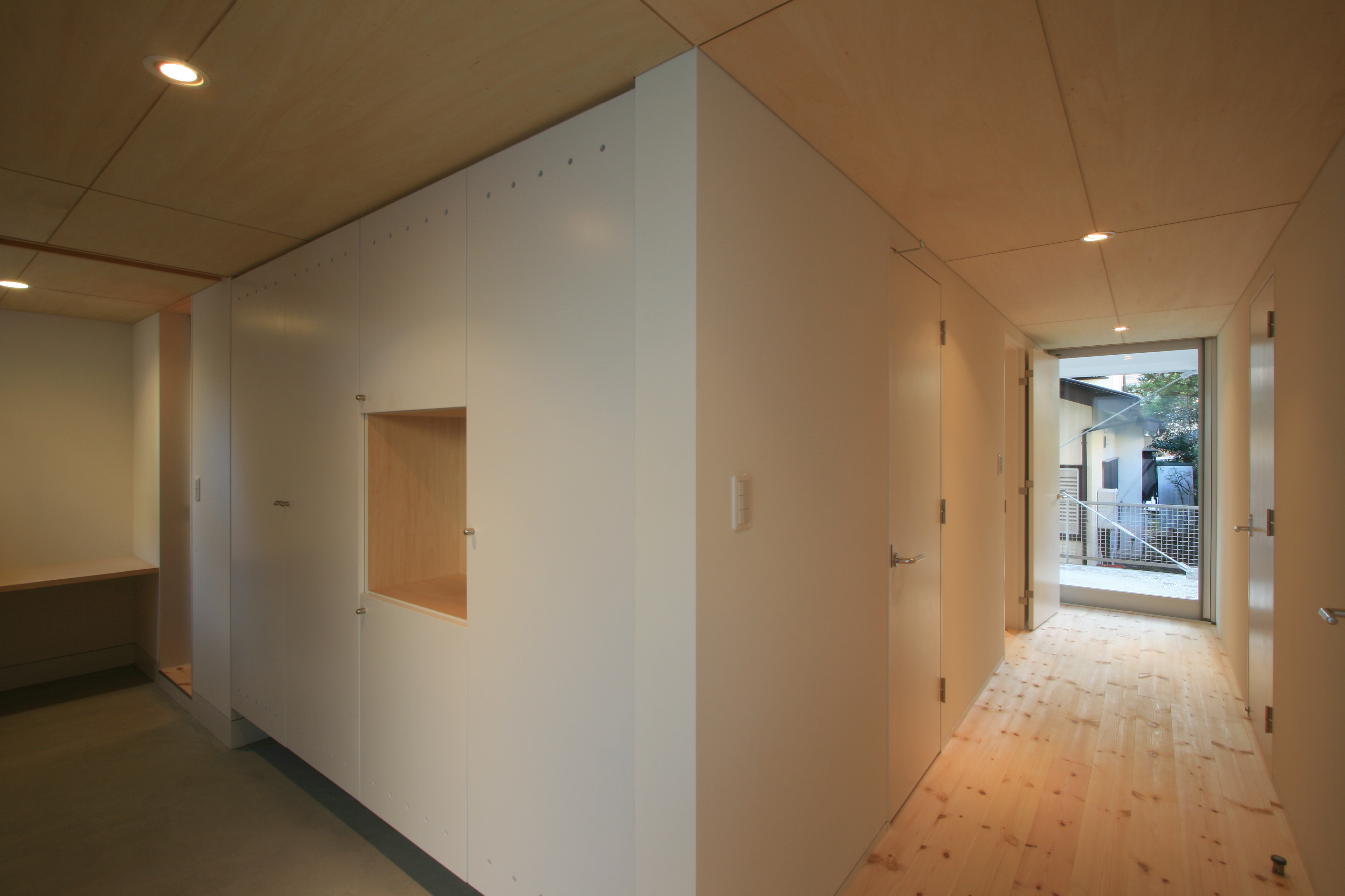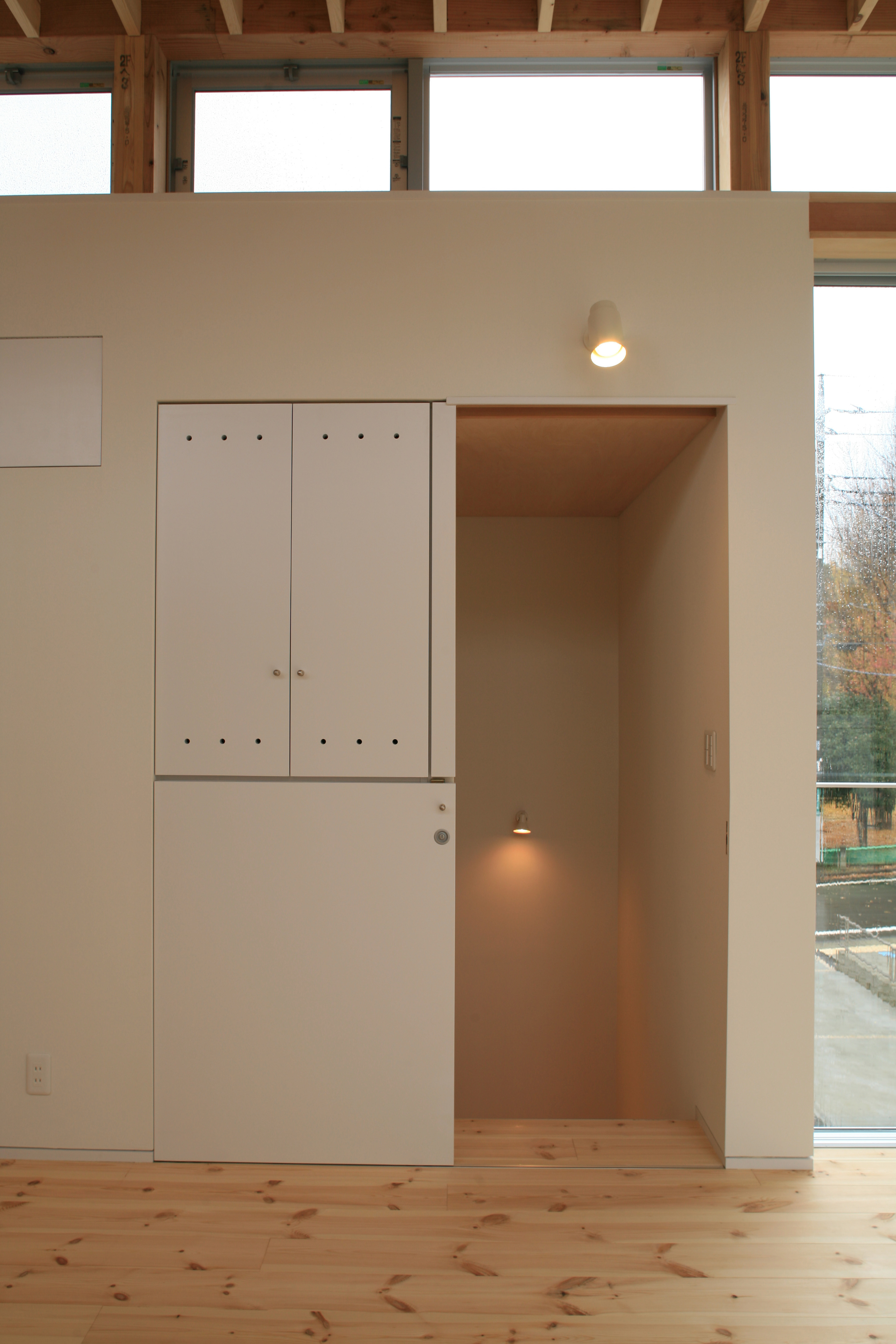 分譲地の中ほどにある旗竿敷地に建つ夫婦と子供1人のための住宅です。