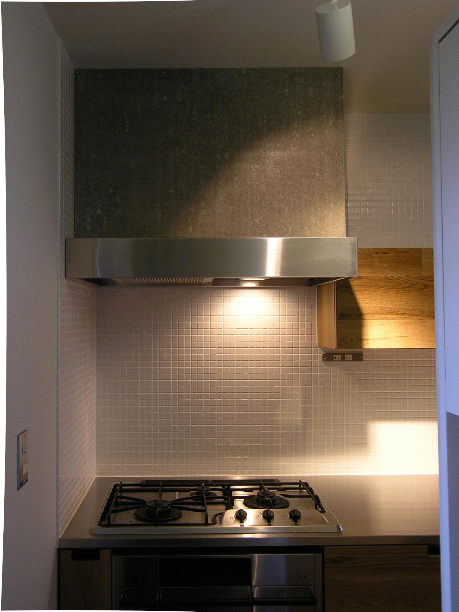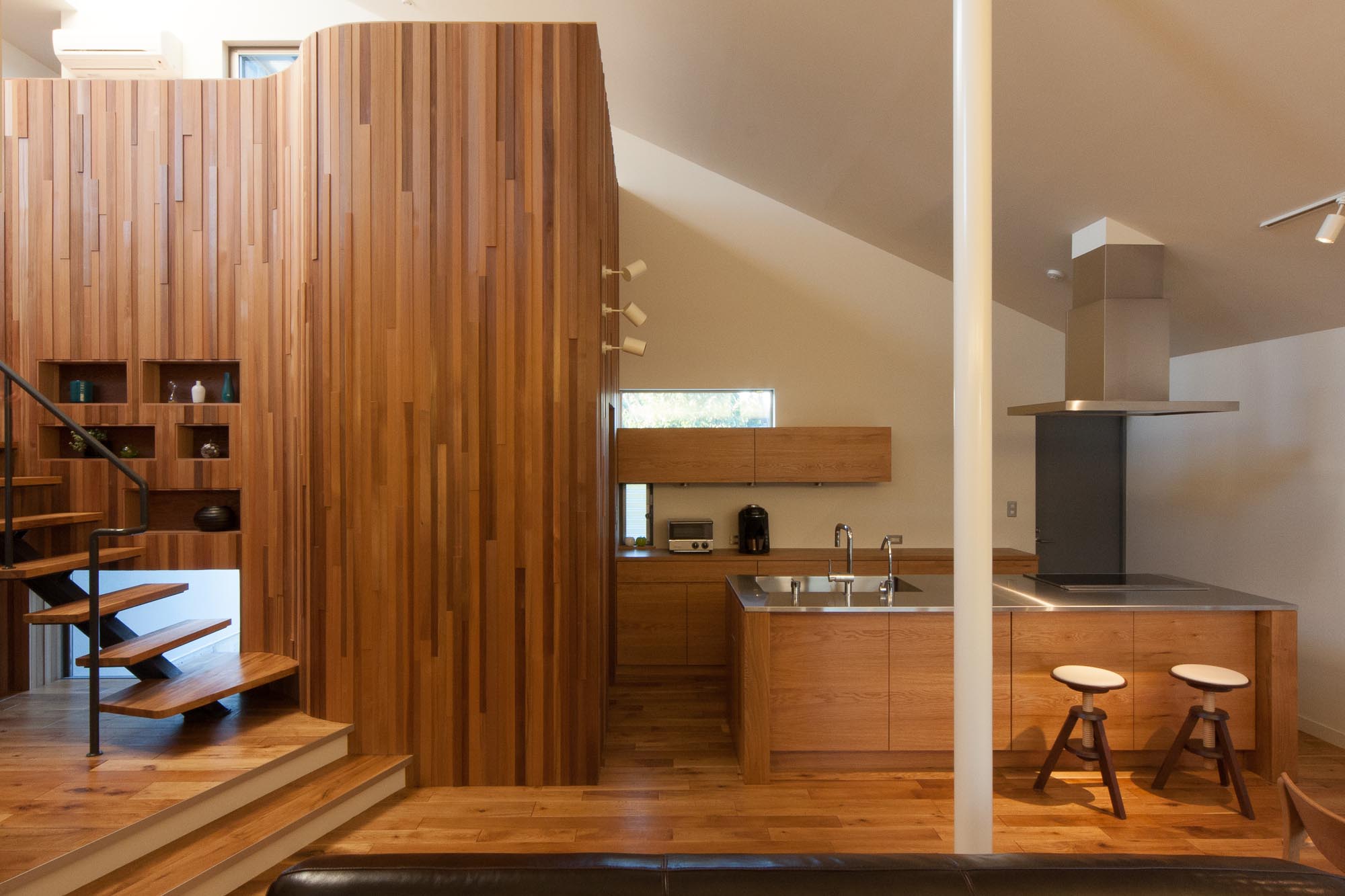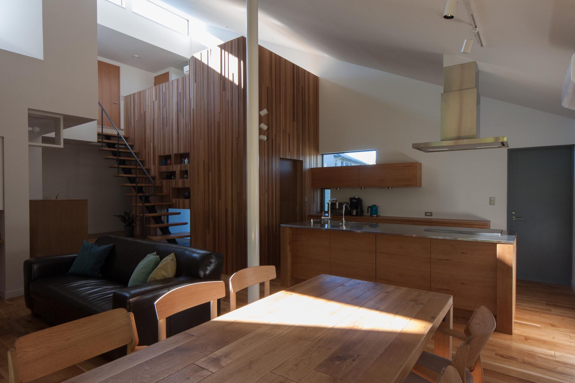 オリジナルのキッチンとダイニングテーブルは、床のフローリングと同じナラの無垢材で作り付けられ素材の一体感が空間を引き締めている。