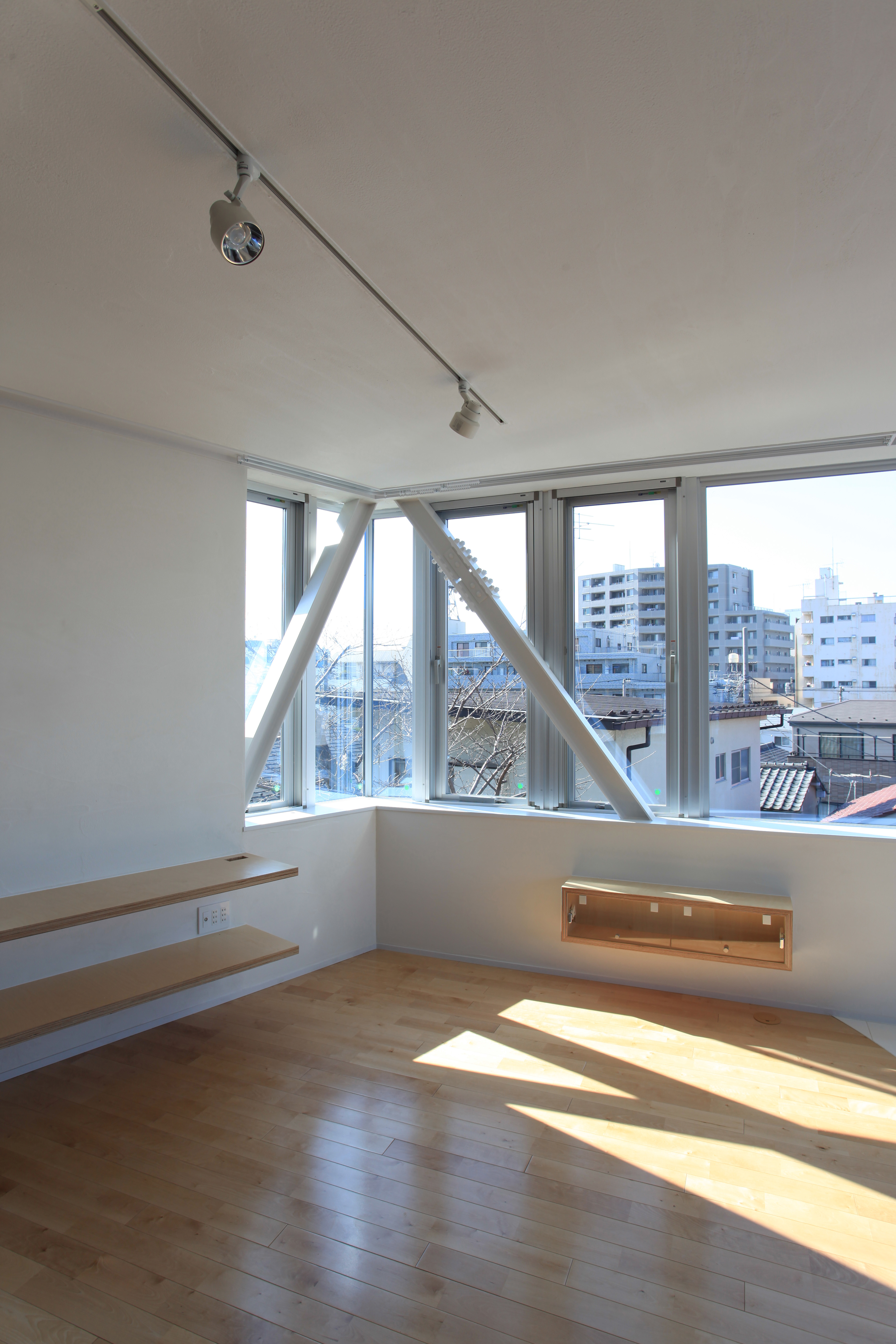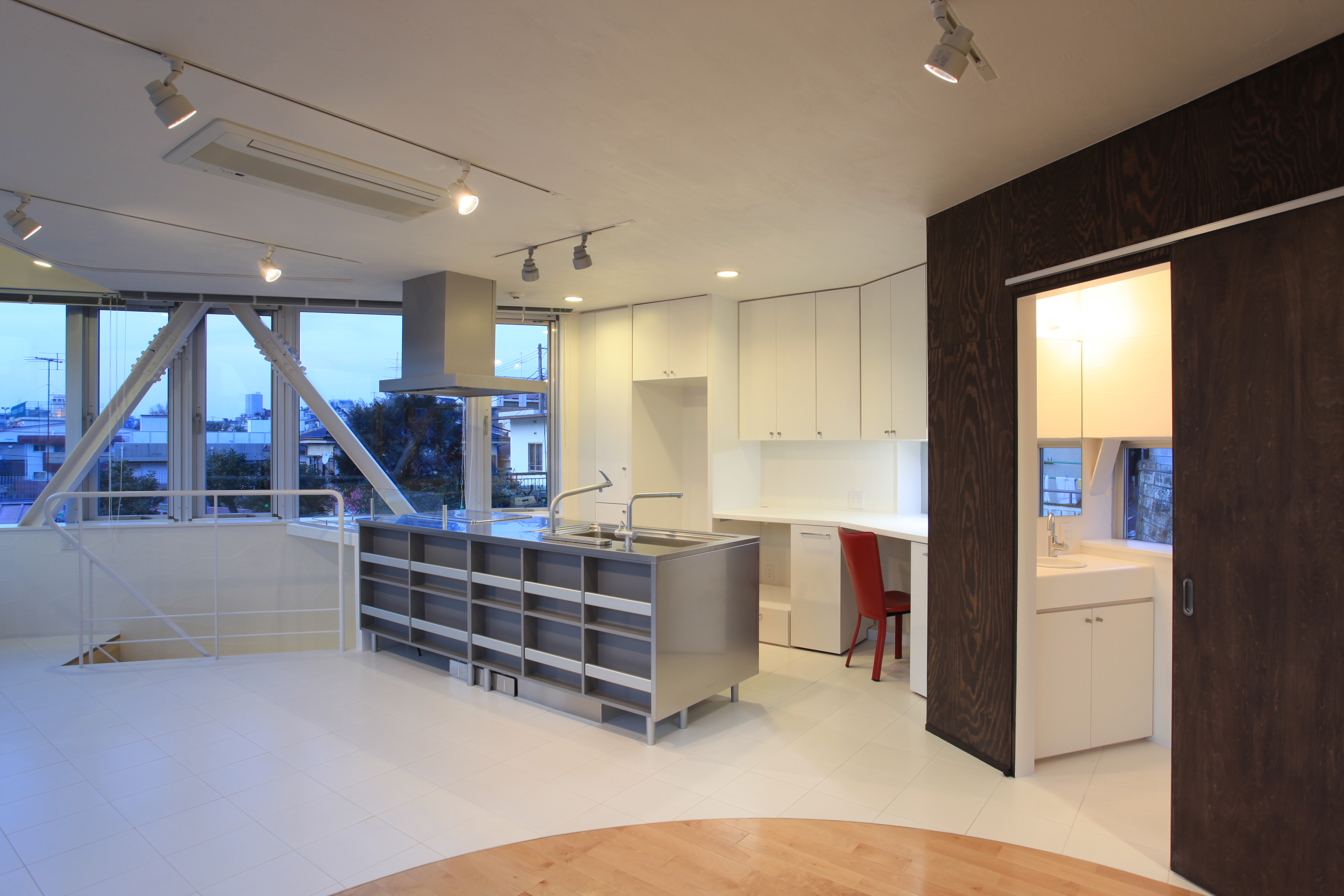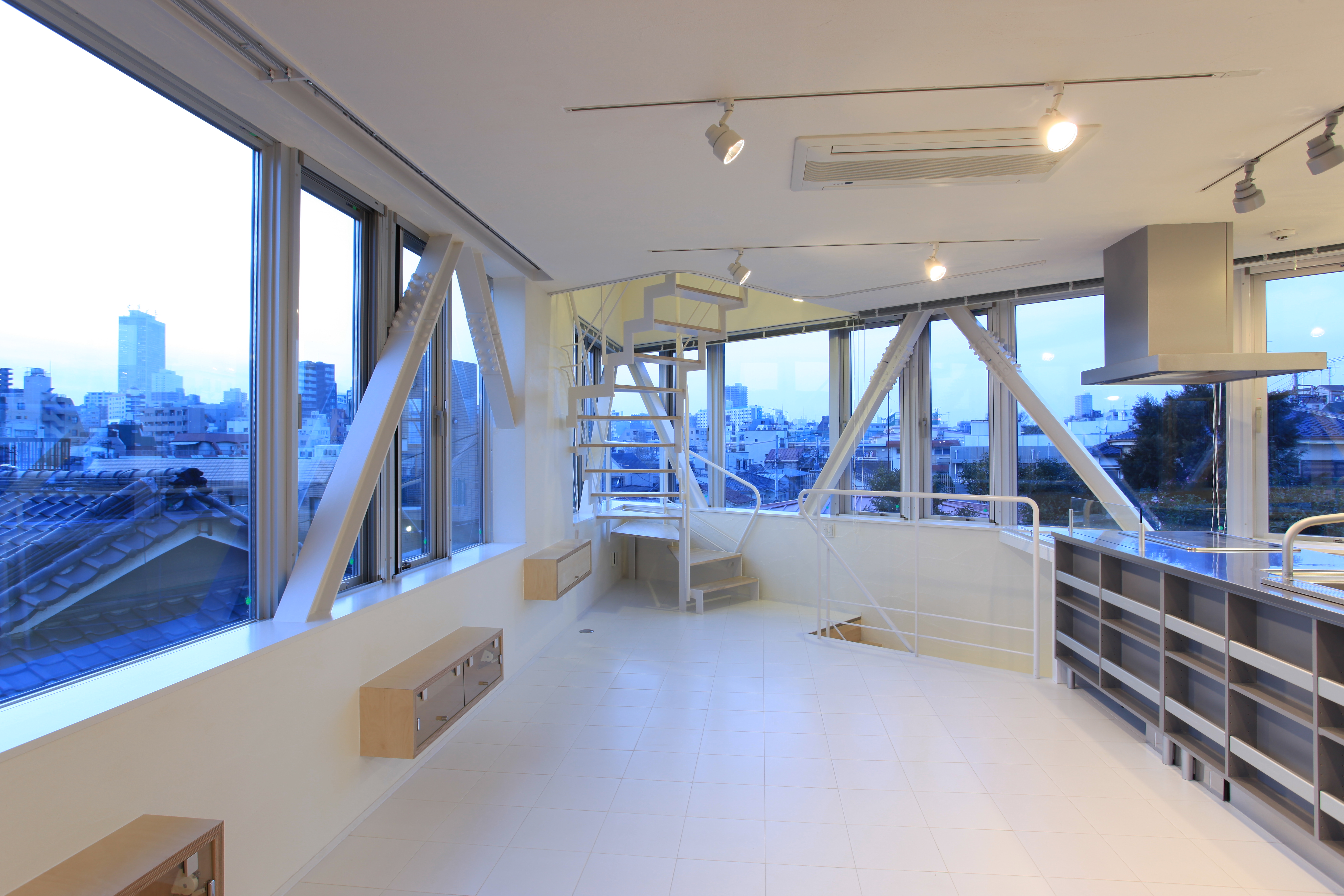 住居部分では、恵まれた立地ならではの眺望を生かすことをコンセプトに、子供室、寝室、水廻りのプライベート領域をそれぞれ3階と1階に必要分の開口部を設けて配置し、2階に設けたLDKからなるパブリック領域はプライベート階とは対照的に、ほぼ全方位を開放した抜群の眺望を取り込む空間としました。