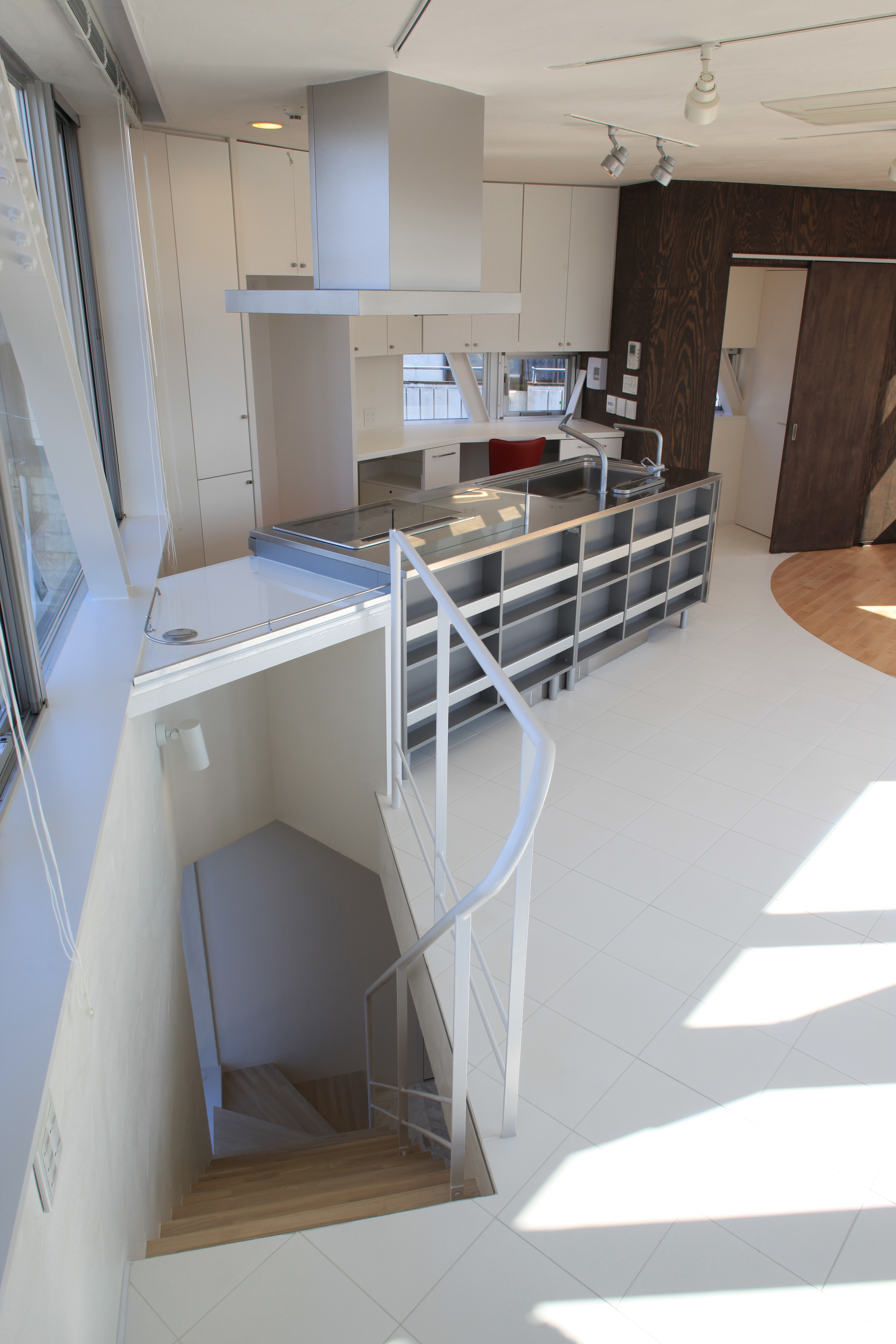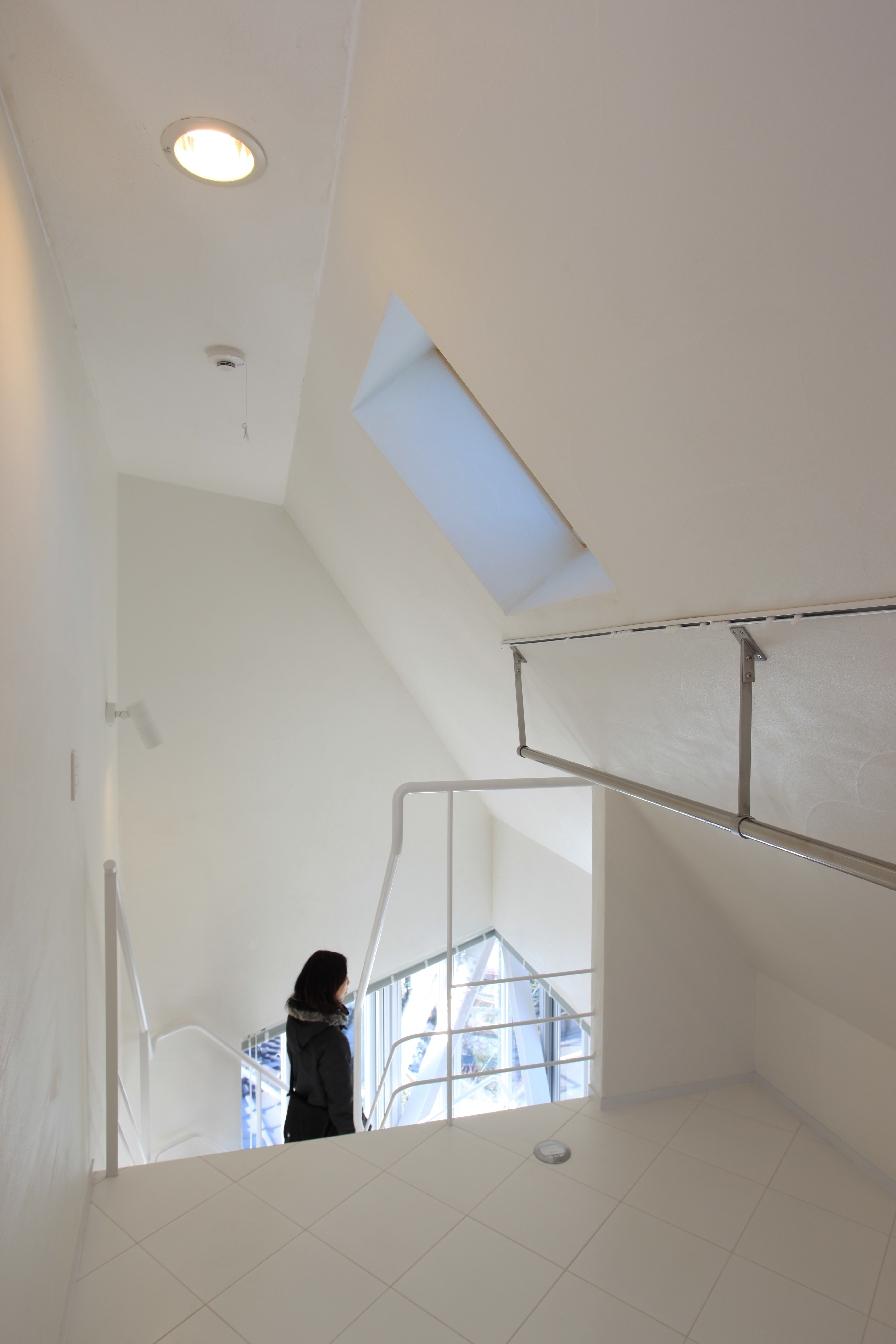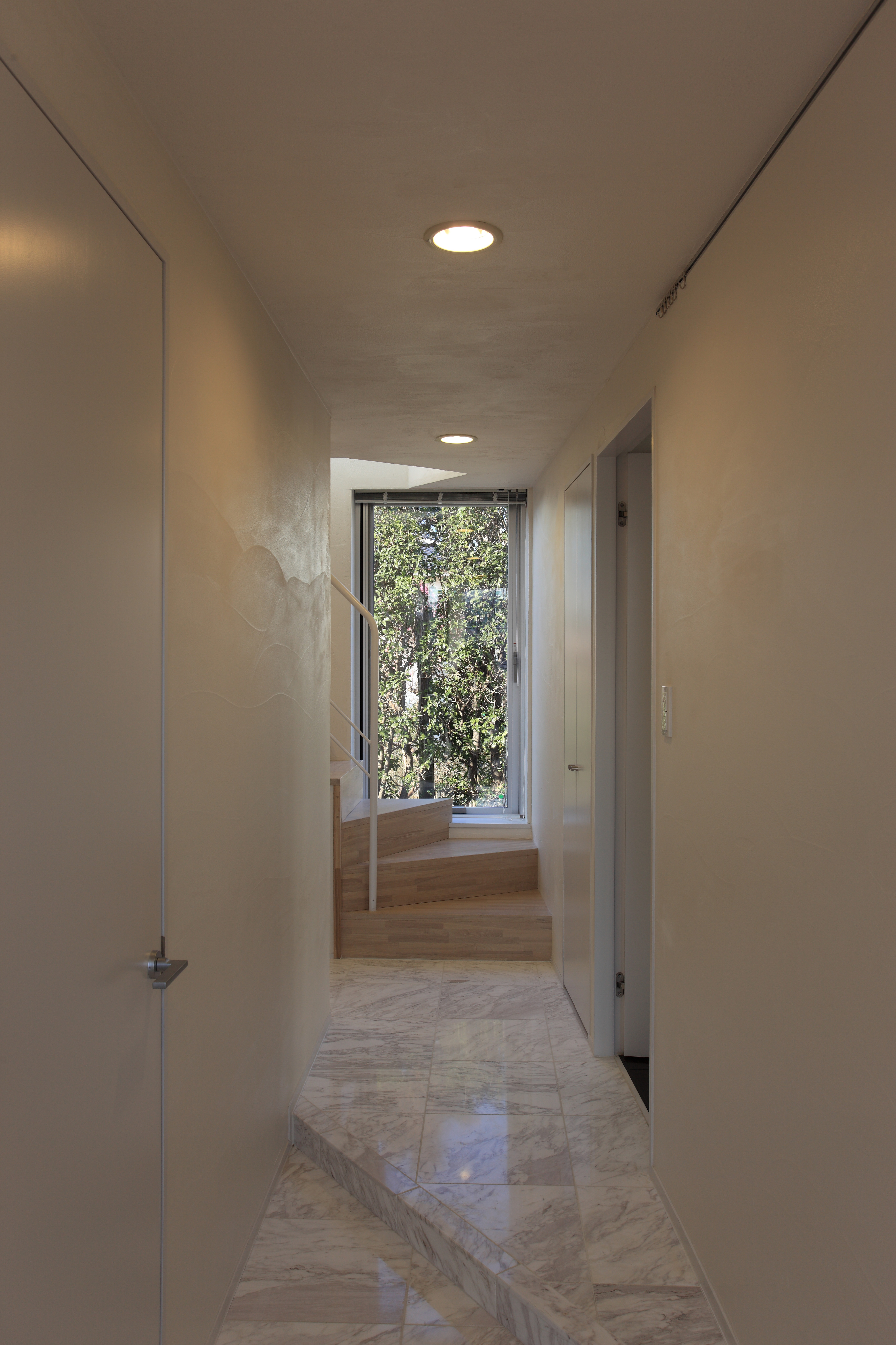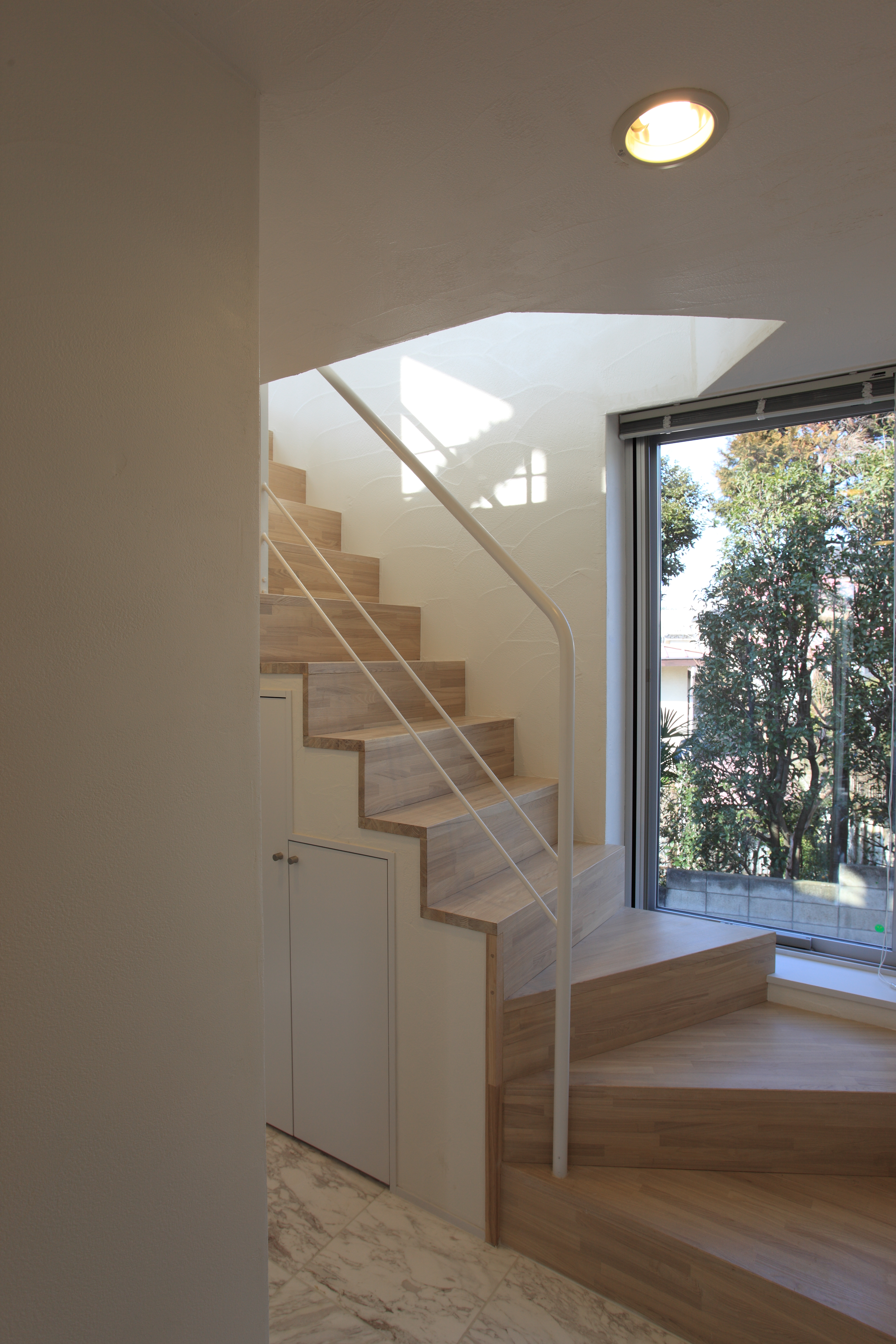 2方を坂道道路に囲まれた不整形の狭小敷地という難条件敷地に、ご夫婦の要望に合わせ、建築基準法の許す限りの地上ボリュームを確保しています。また、狭小地ながらも、敷地高低差から法規上地下となる北側道路から繋がるレベルにRC造の地下を作り、ご主人の趣味でもある車2台分のガレージも備えています。