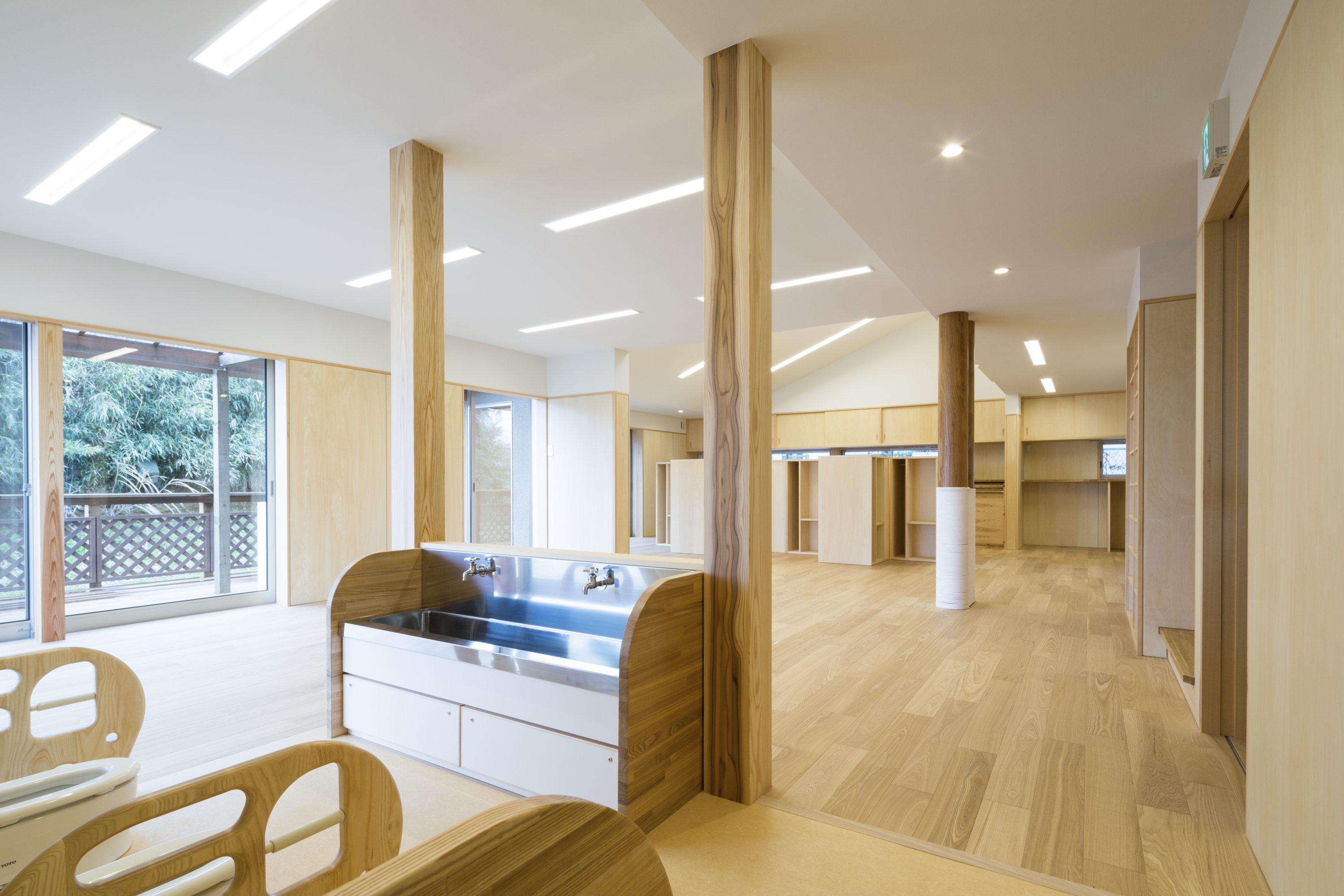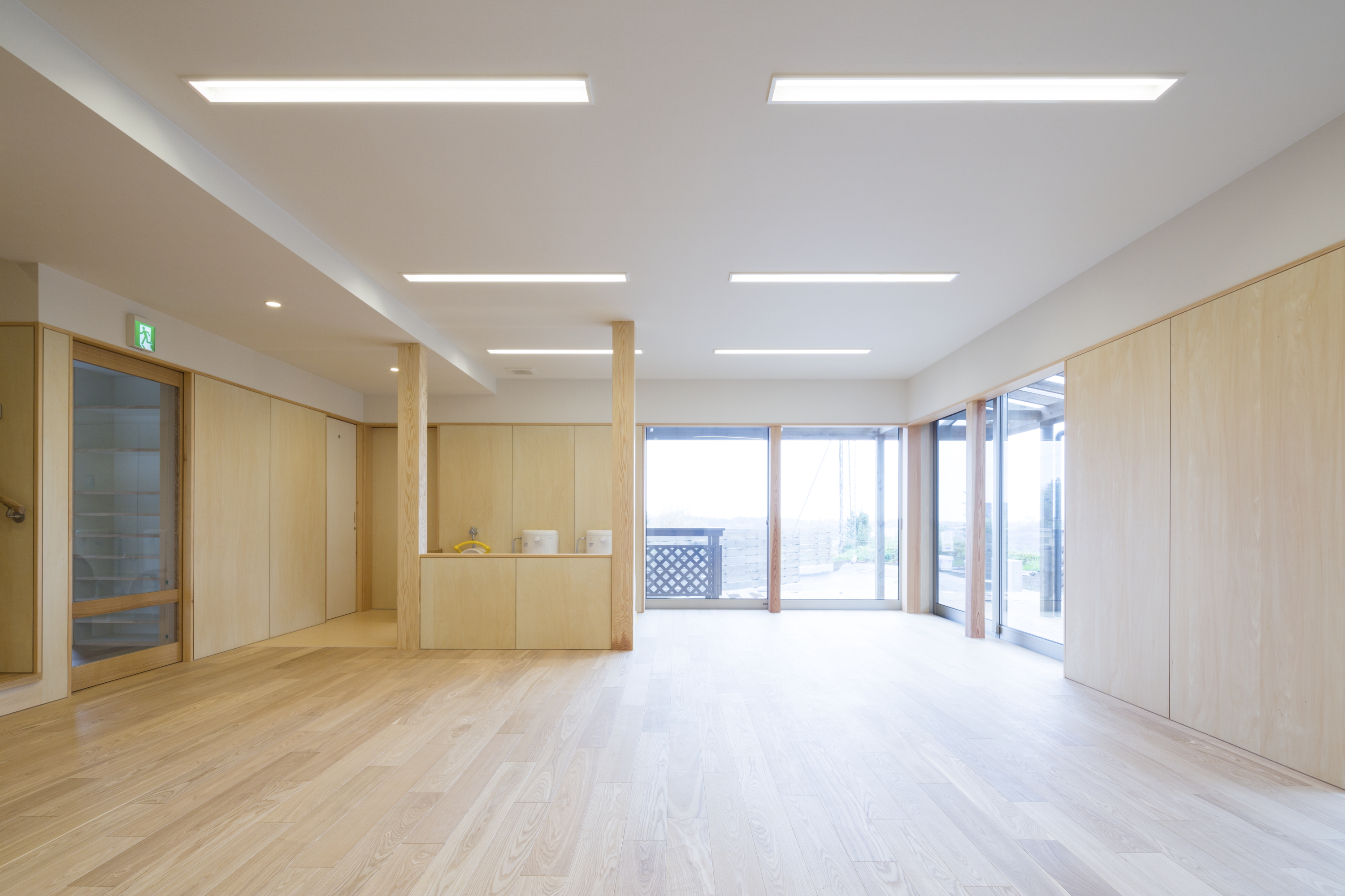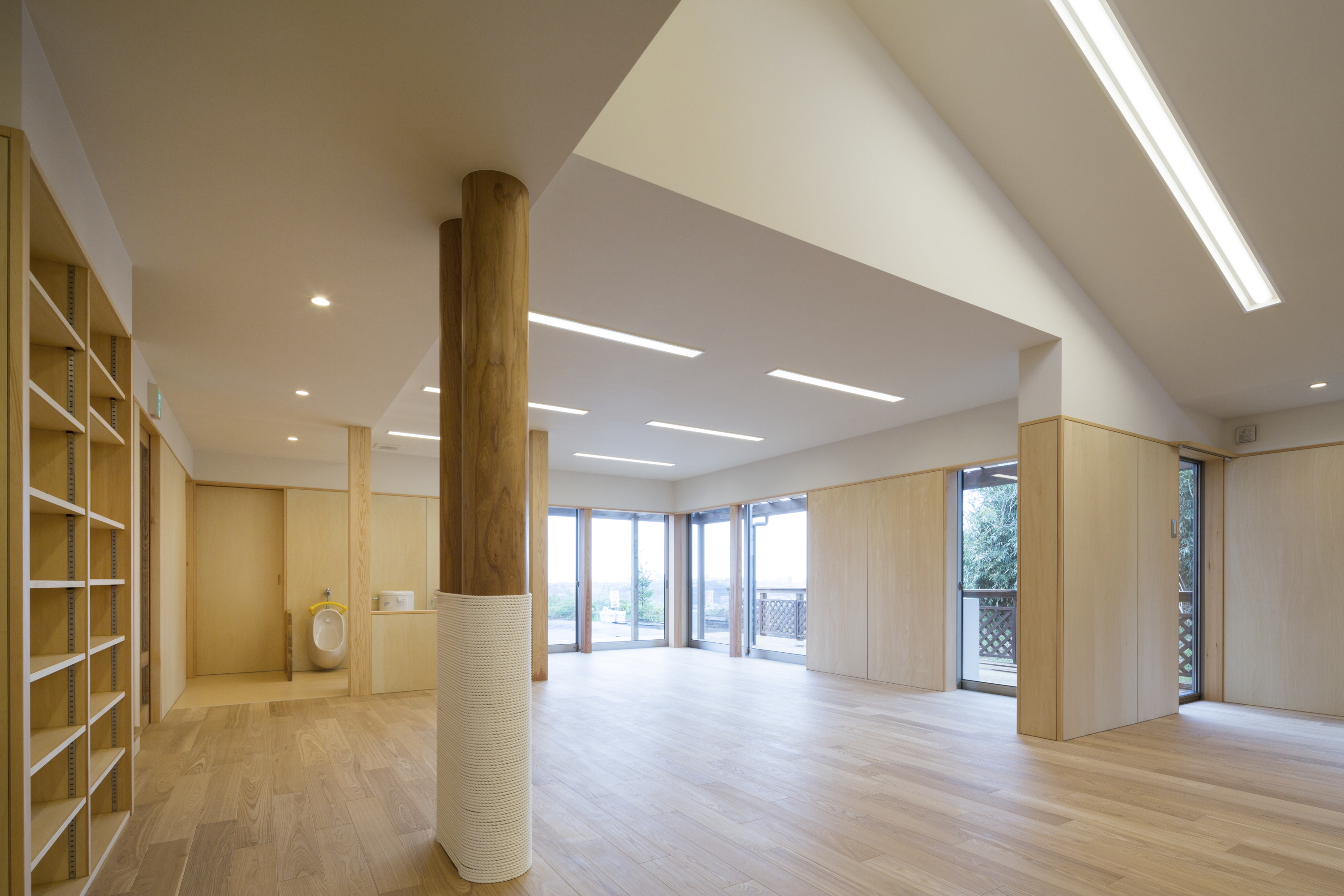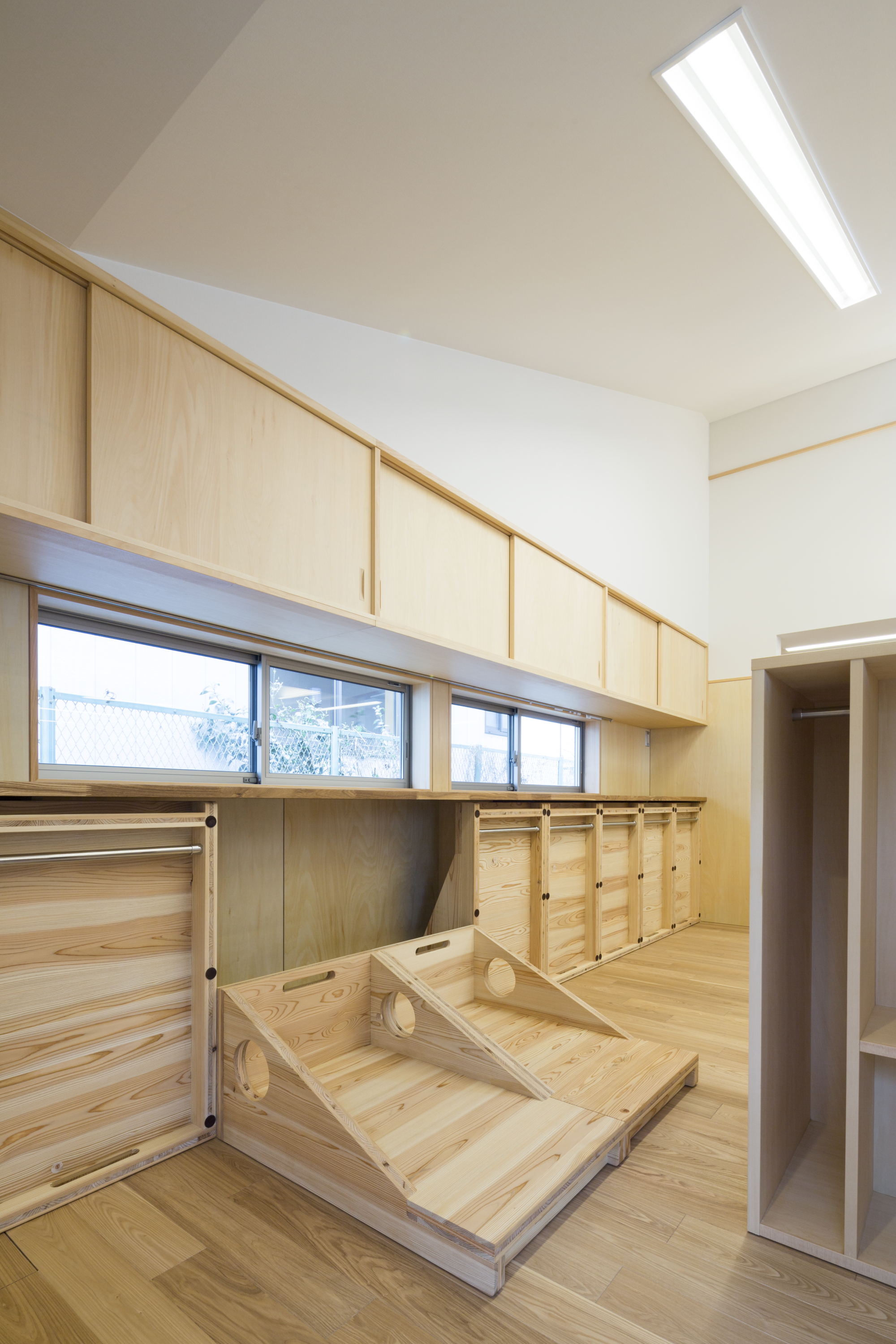 園の方針でクーラーはつけません。屋根はシルバー、断熱層の上にしっかり通気をとることで部屋の中に熱が入りにくくなります。そして風が抜けるよう窓を配置しました。これで夏を乗り切れるでしょう!
