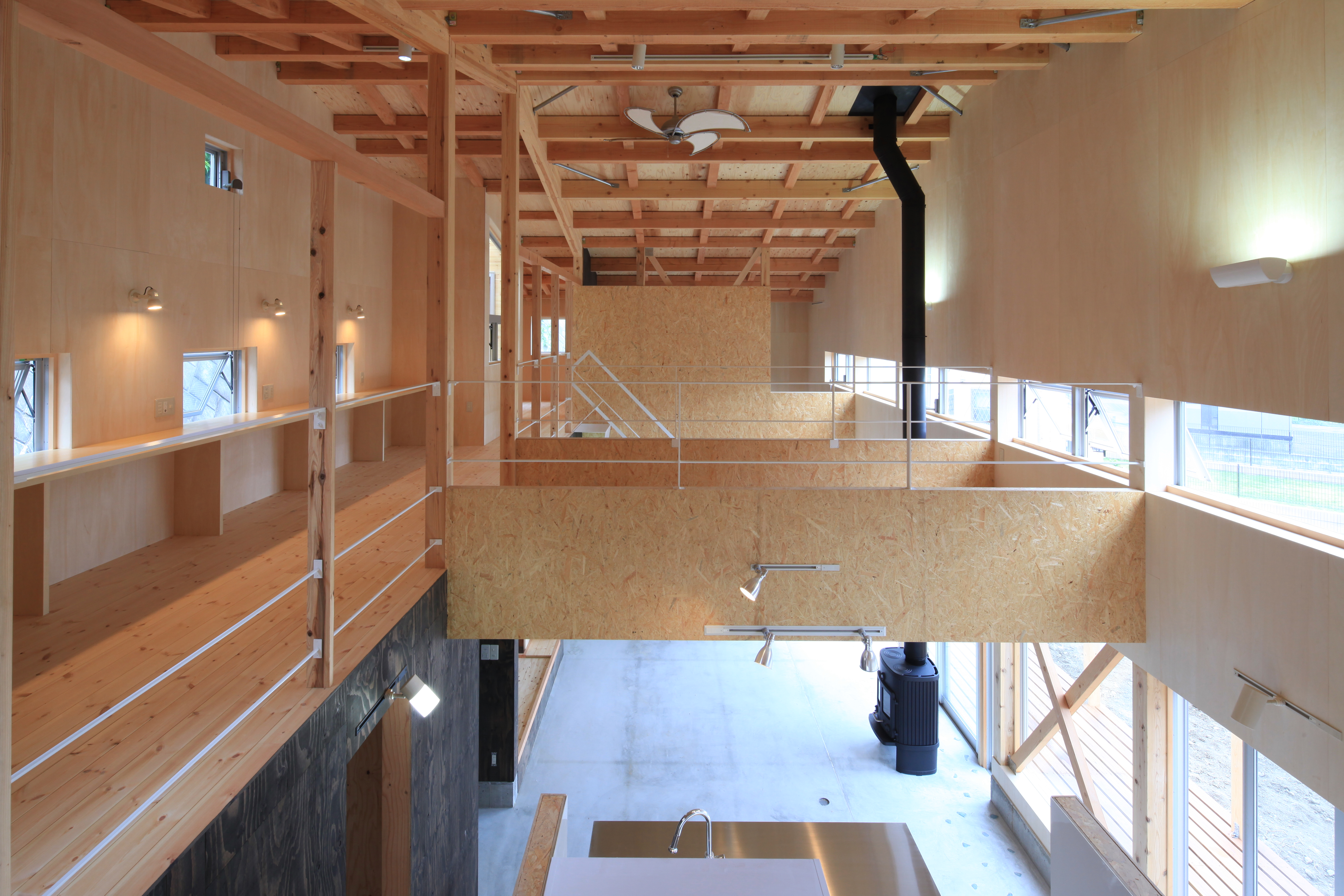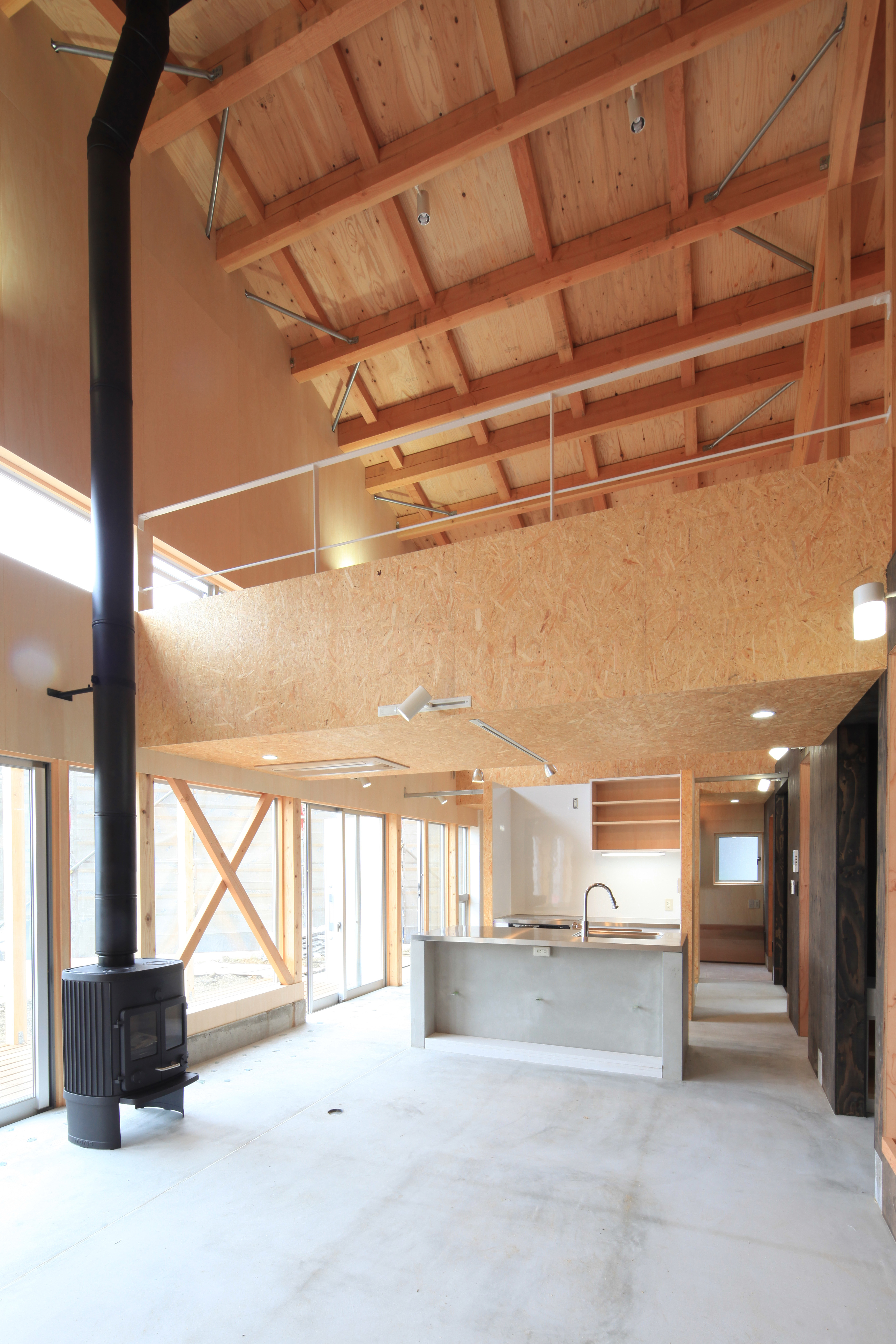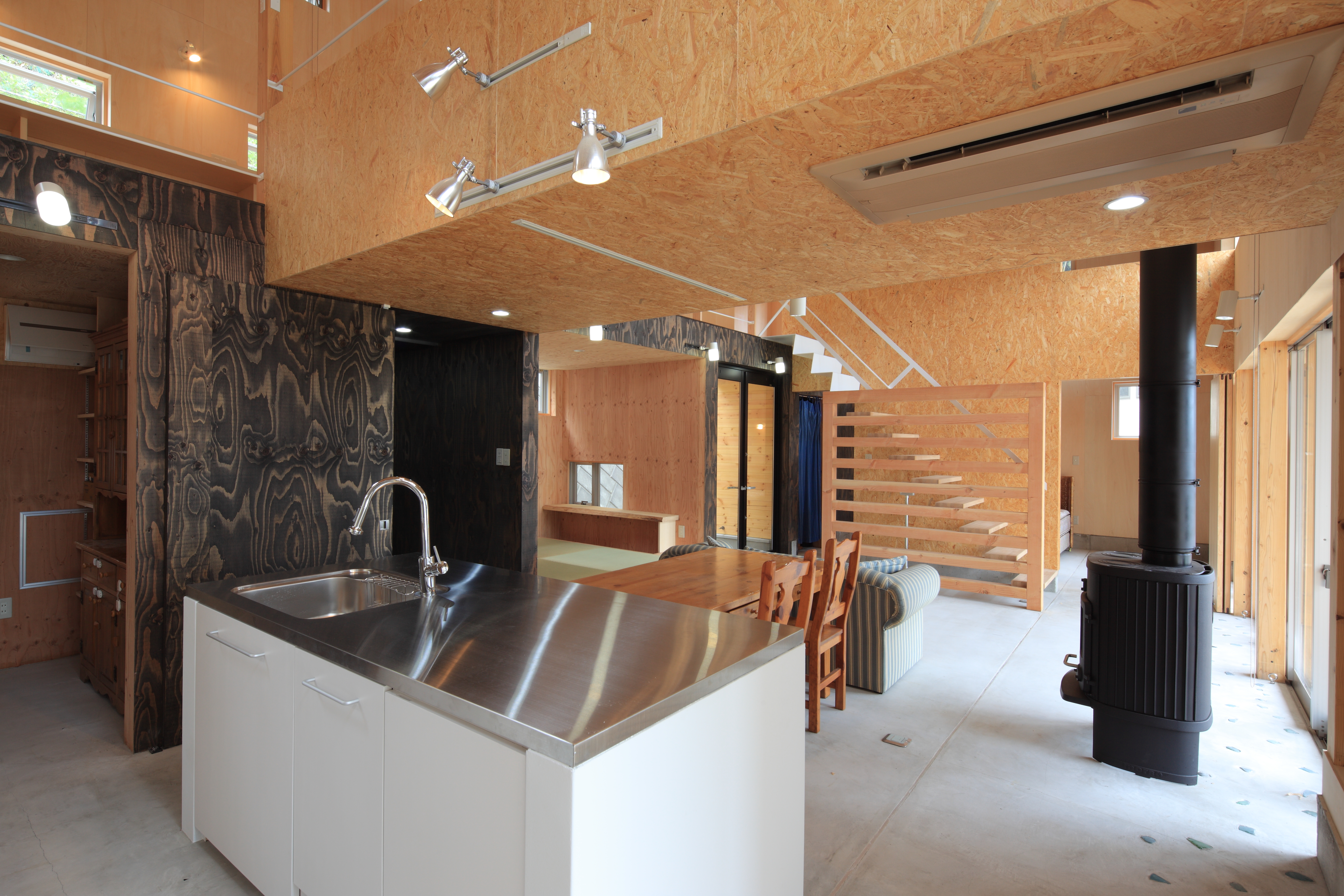 1階には蓄熱式の床暖房と薪ストーブを配置し、暖められた空気を攪拌する快適な環境を作り、屋根に載せた太陽光パネルと薪ストーブからの自然エネルギーを料理に使う等、エネルギーを無理なく取り込む住まいで、ほど良い距離で穏やかに暮らす、ごはんの美味しい生活を楽しんでいます。