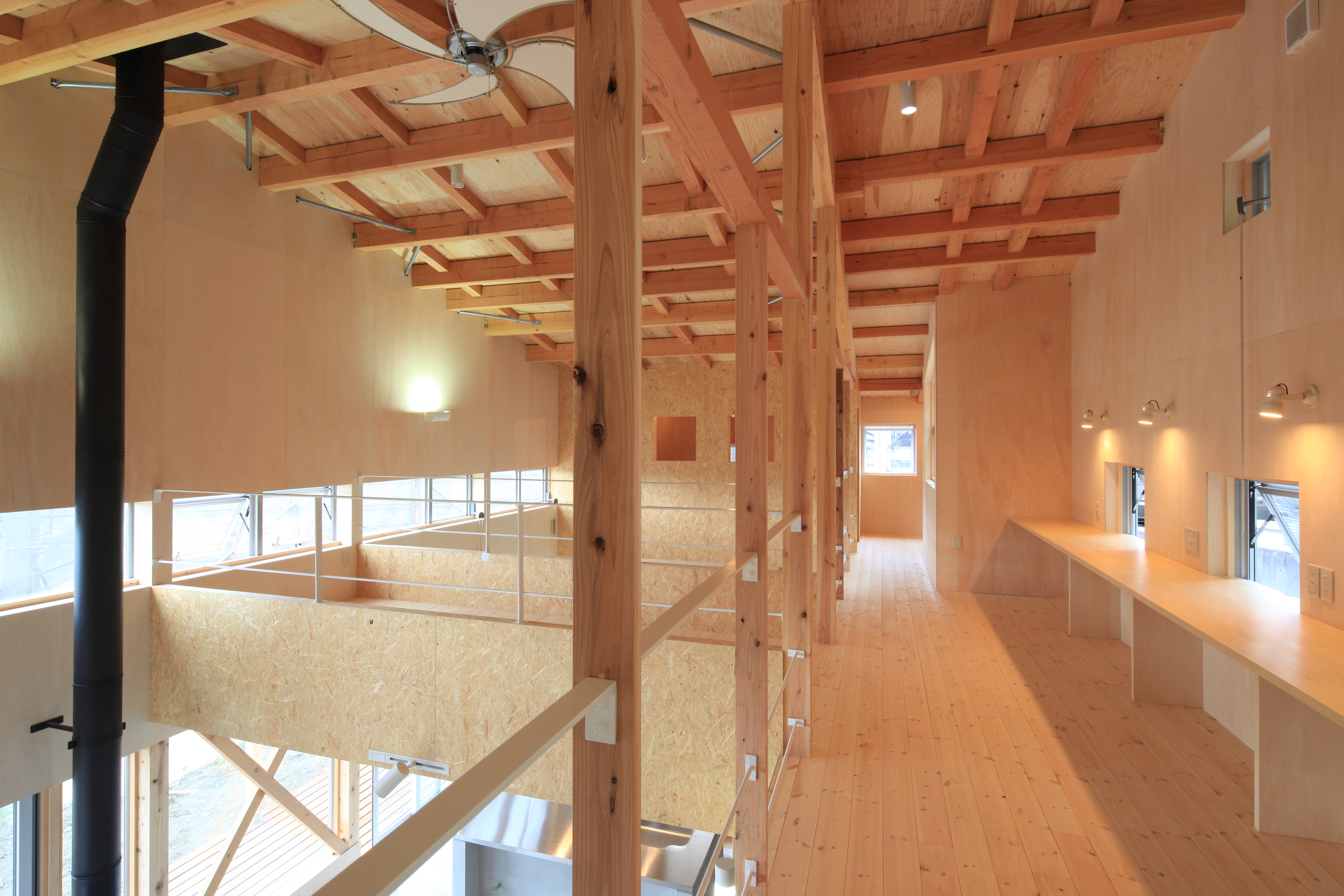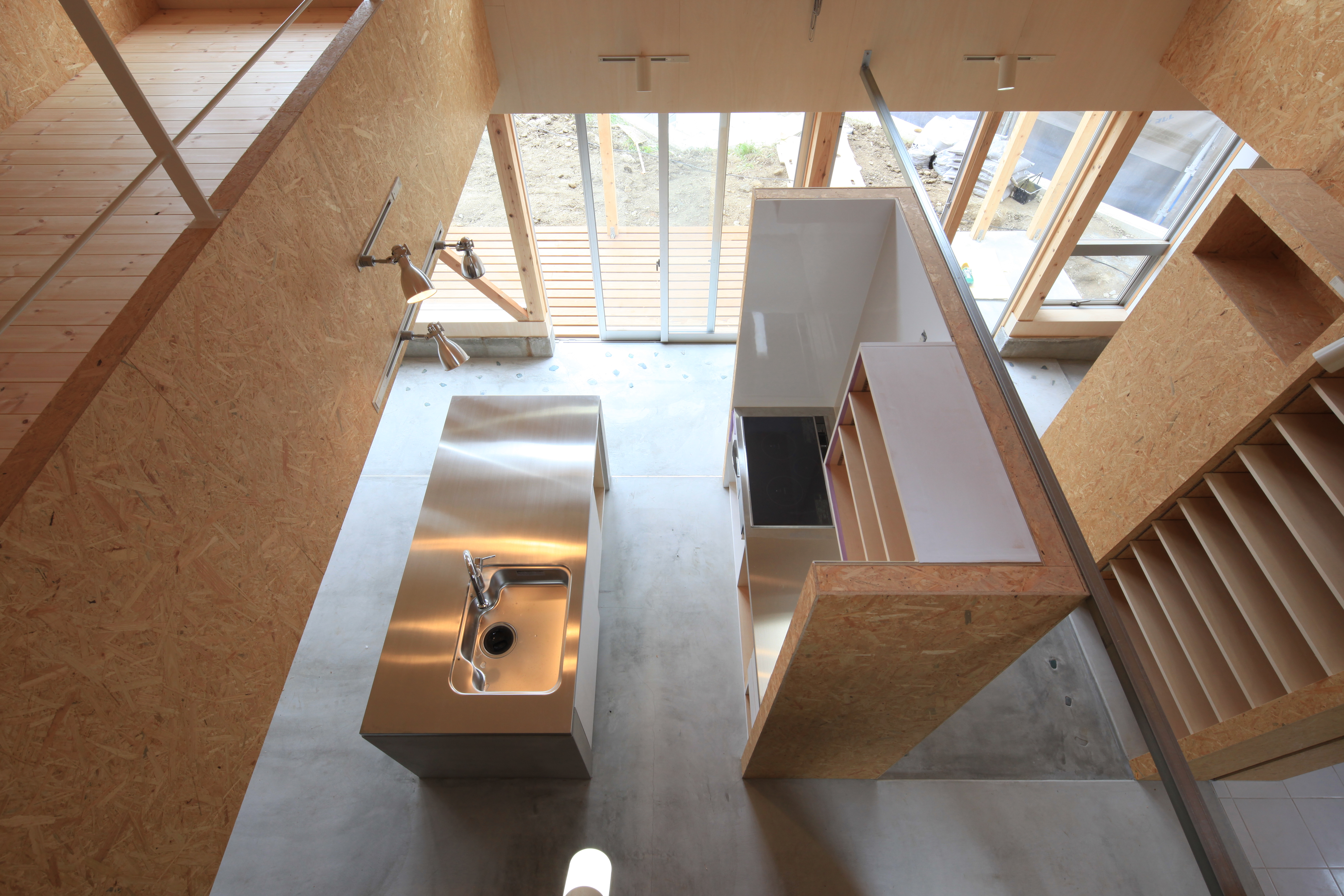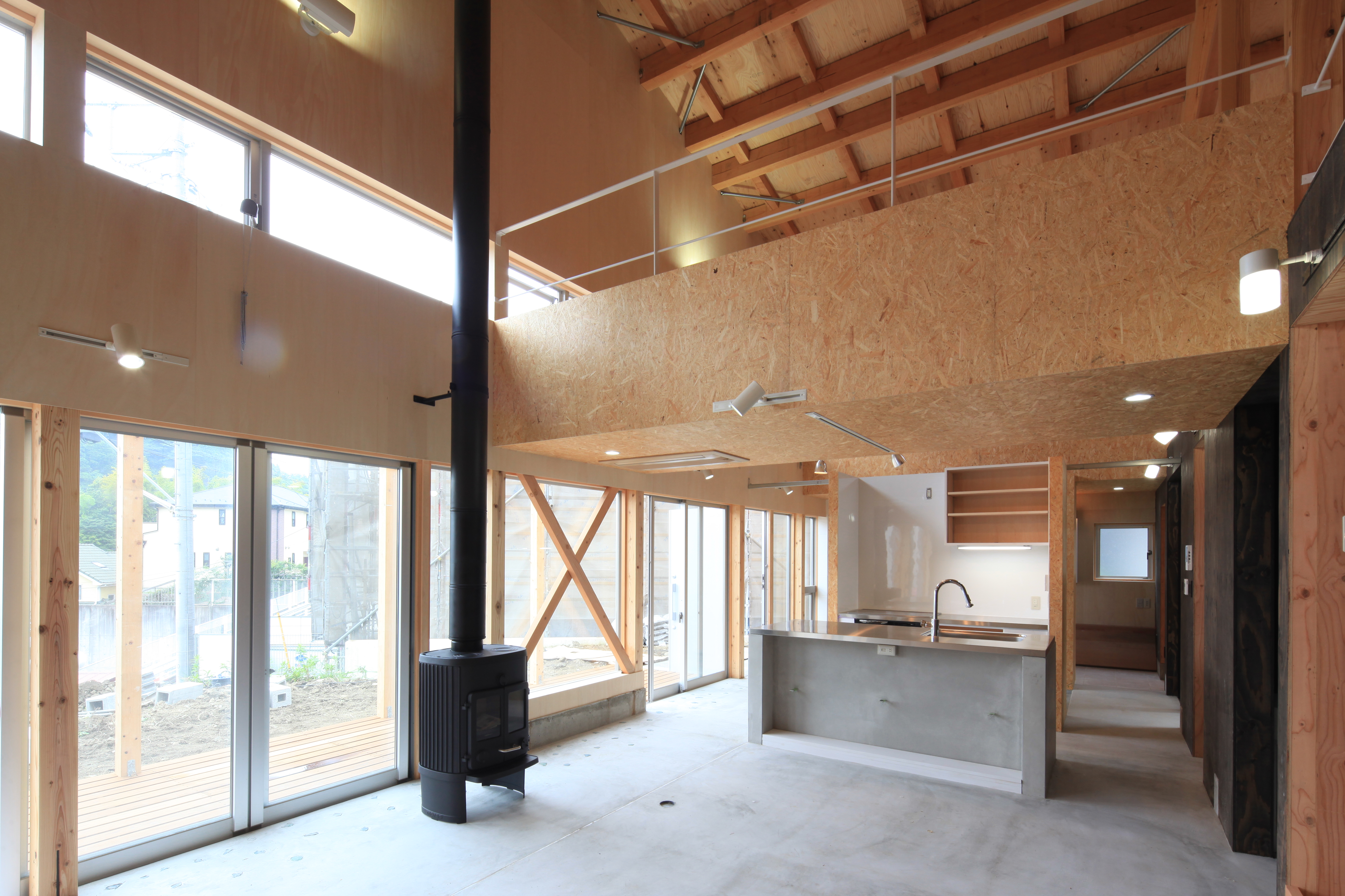 1階には蓄熱式の床暖房と薪ストーブを配置し、暖められた空気を攪拌する快適な環境を作り、屋根に載せた太陽光パネルと薪ストーブからの自然エネルギーを料理に使う等、エネルギーを無理なく取り込む住まいで、ほど良い距離で穏やかに暮らす、ごはんの美味しい生活を楽しんでいます。