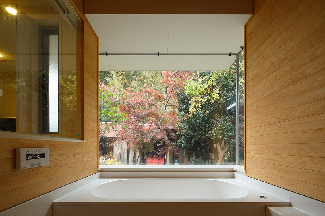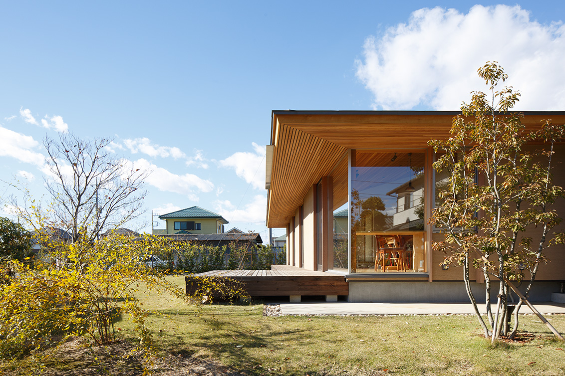 東南の角に開口部を大きく設け、朝日が入るだけでなく、ダイニングから母屋の状況が分かるようにしています。南側の掃き出し窓は全て、引き違いのサッシの半分を壁の中に入れ、障子と共に引き込み戸としています。