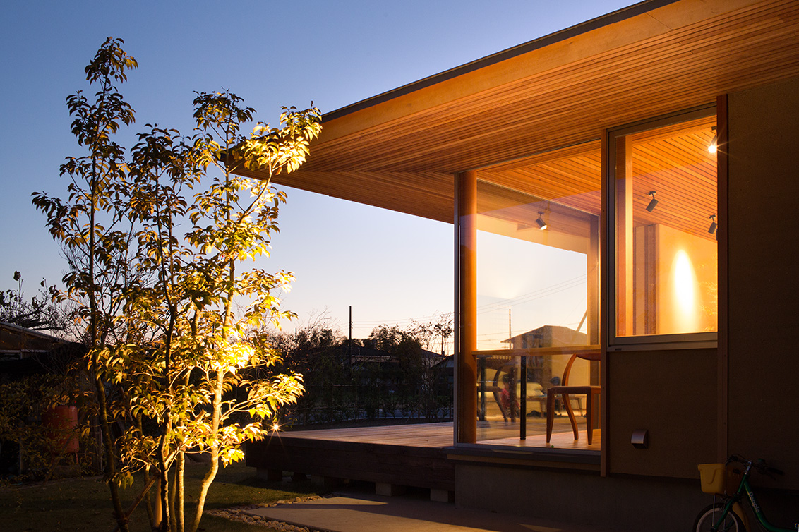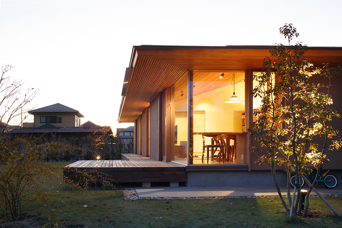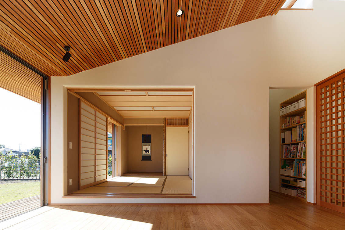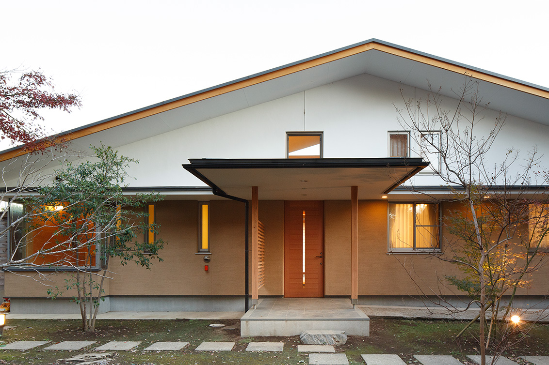 建物は、南側を日本に古くからある入母屋の屋根を大きく広げ、母屋屋根の高窓から廊下に光を落とし、北側は切り妻の大屋根とする平屋建ての家です。
