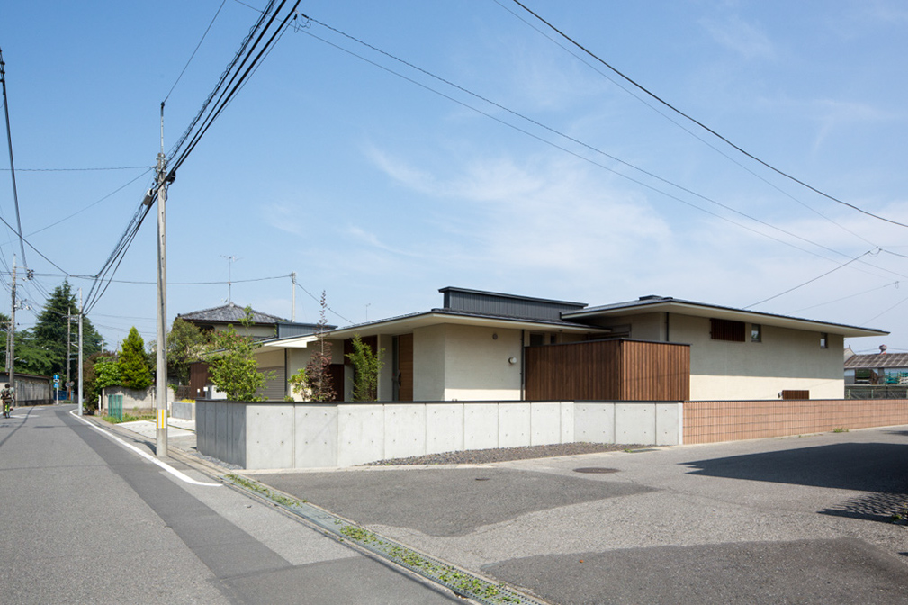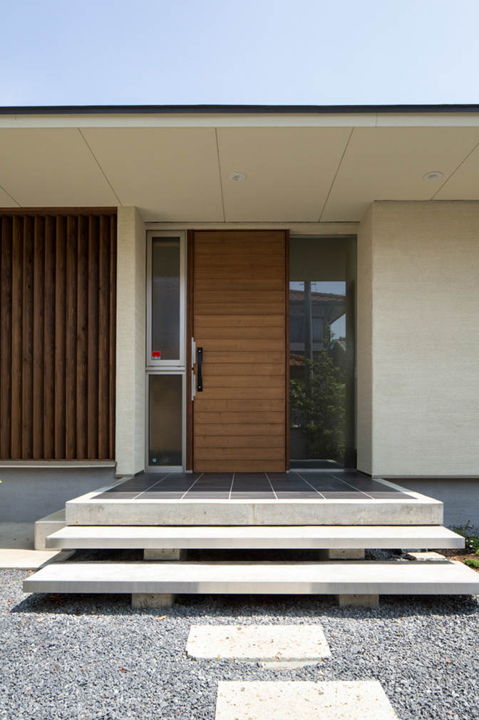 廻りの視線を気にせず生活できる住まいをということで、外周壁には中を伺わせる開口部を殆ど設けず、門も塀も低く抑えて、玄関ドアまでは中を見せて、迎え入れるようにしています。