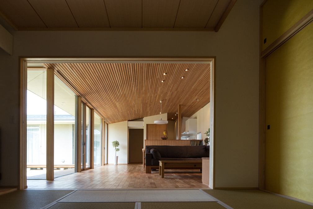 居間を通らず和室に入れるようにもなっていますが、仕切りの襖を全て引き込むと居間と一体空間になります。