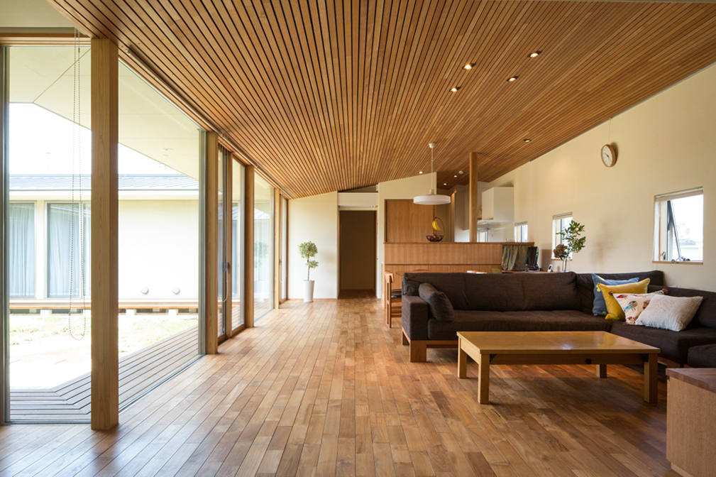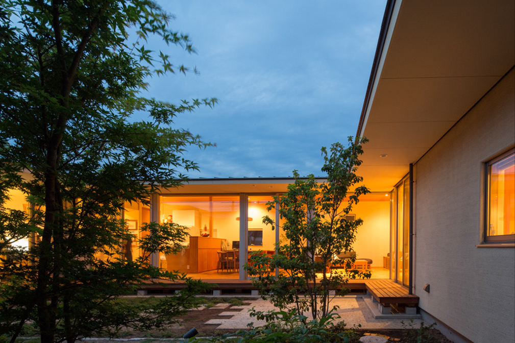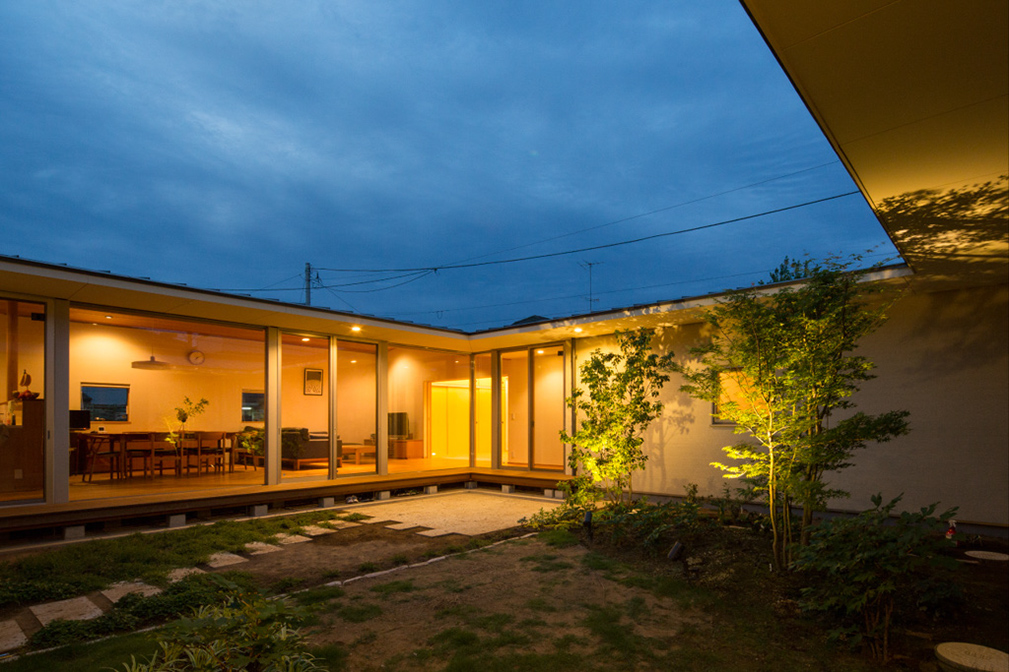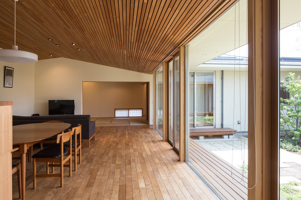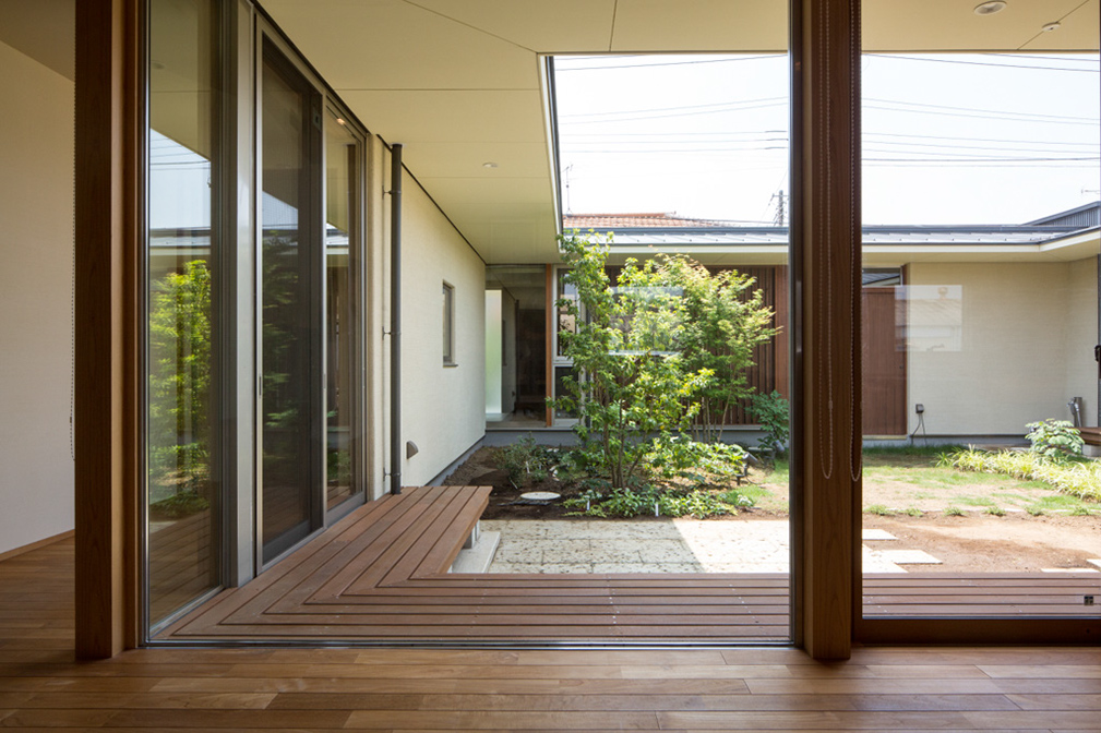 外周の殆どが壁でも、中央に大きな中庭を設けてあり、居間食堂始め殆どの居室の開口部がその中庭に開かれているため、開放的な住まいになっています。