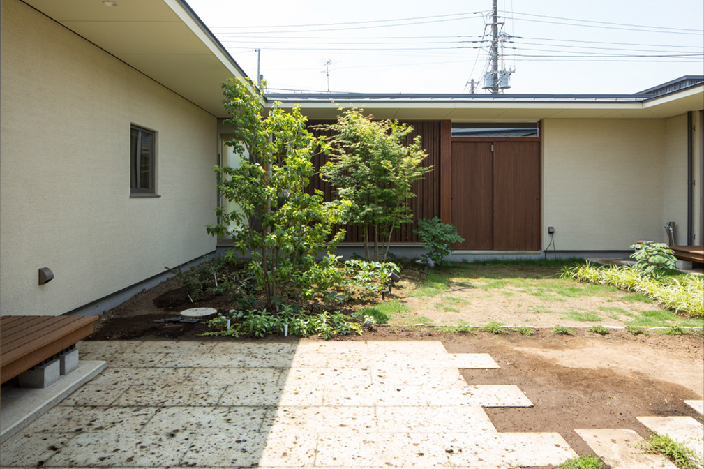 広い中庭は、屋外での食事スペースや子供達の遊び場や小さな菜園もあります。でも周囲の近隣からは四方に屋根があるため、全く覗かれません。