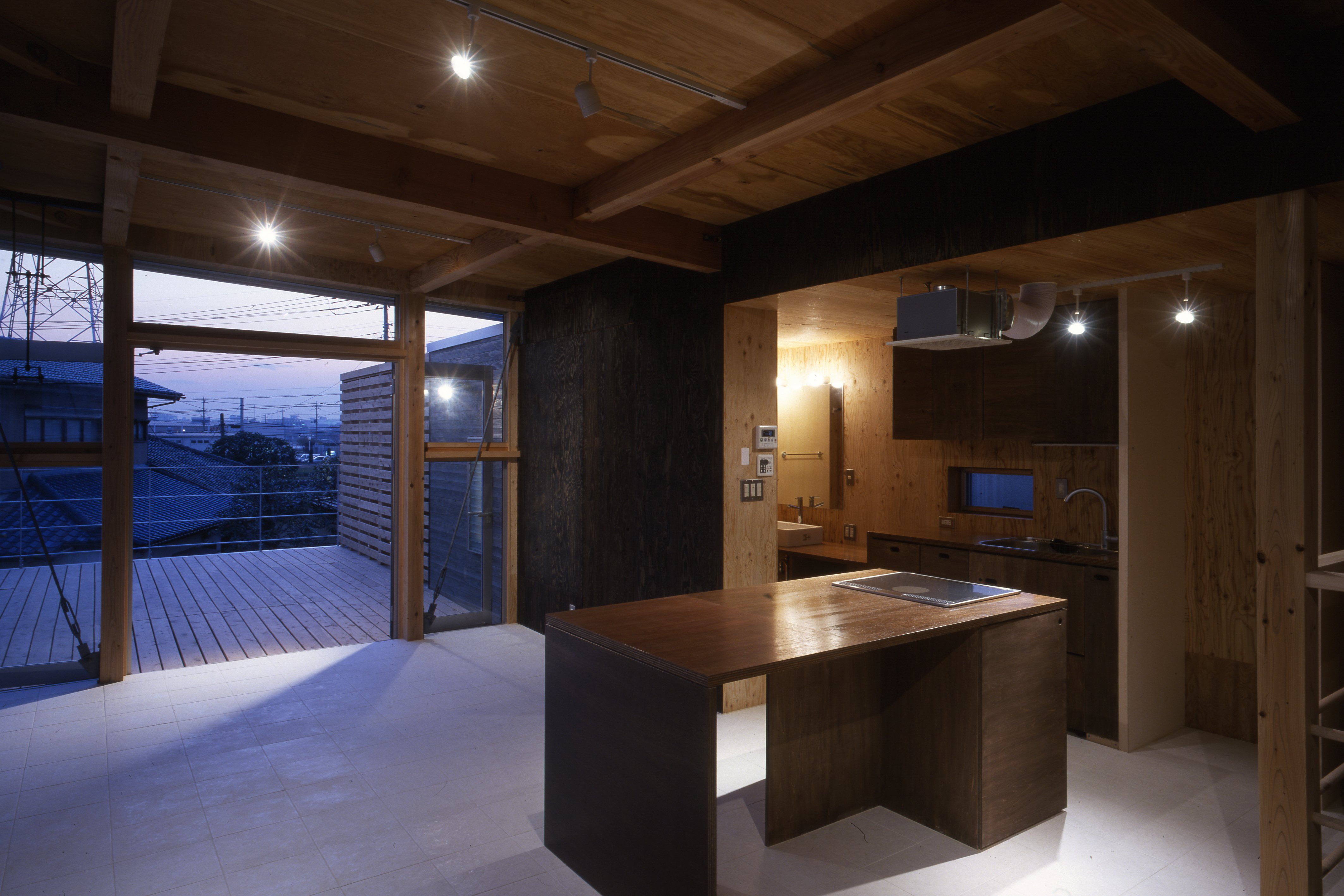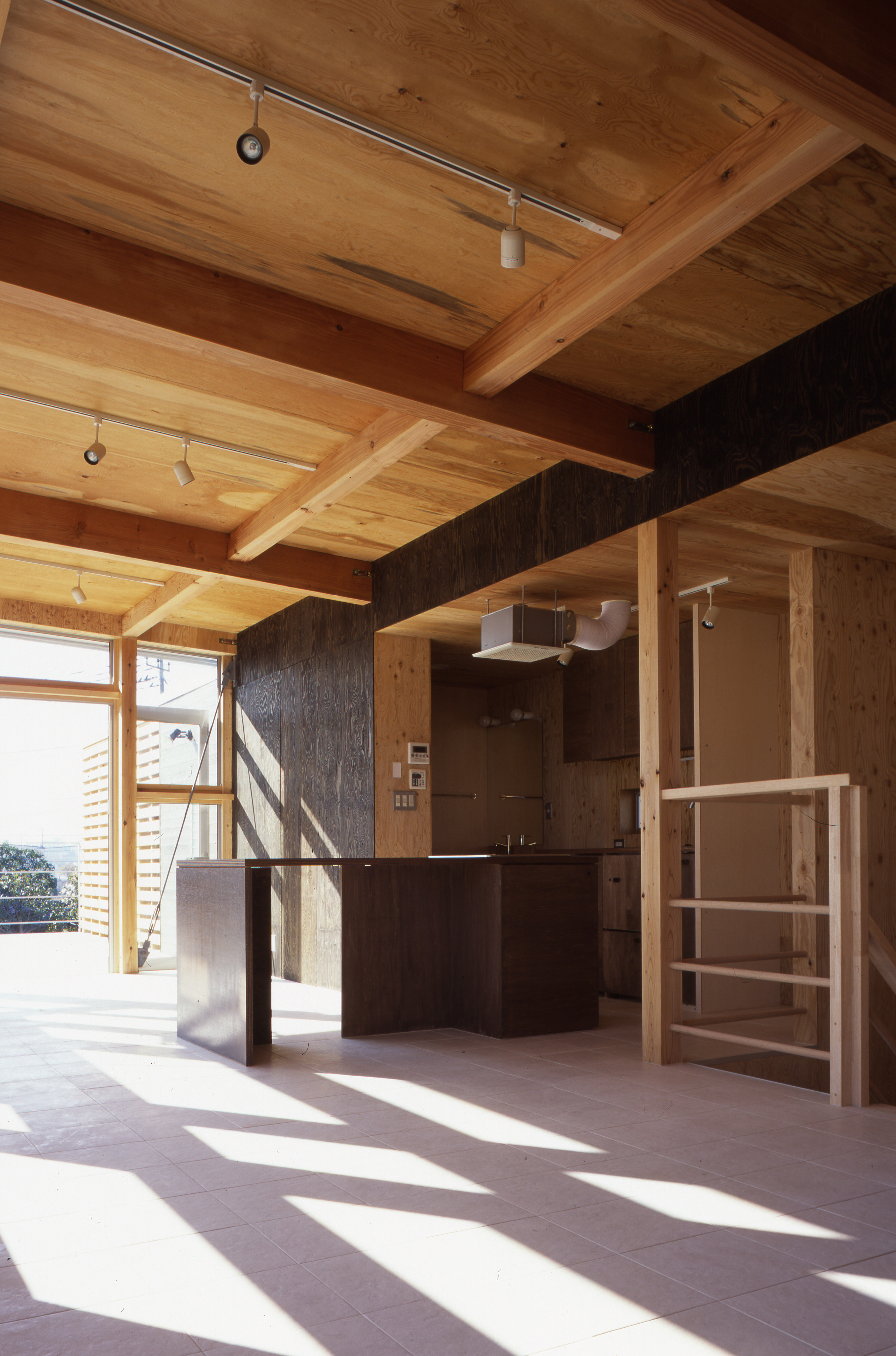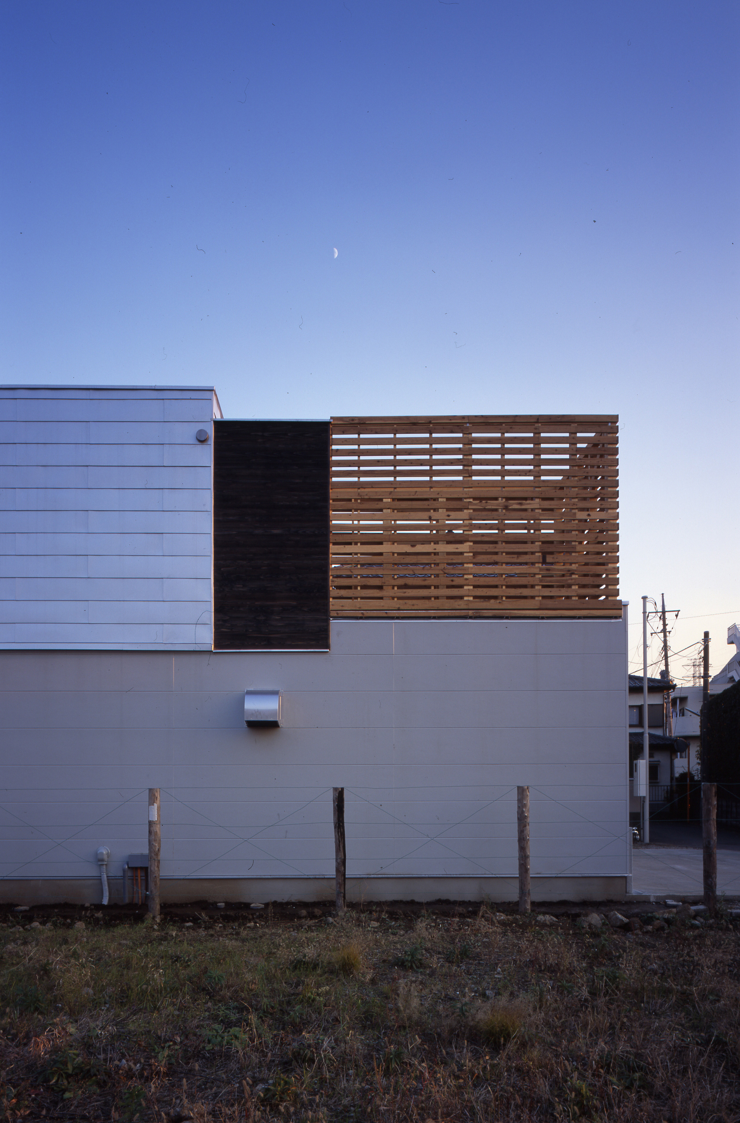 とにかく車が好きで、「友達と集まれる男の隠れ家のようなスペースを備えたガレージ」をご希望するご主人と、車には興味が無く、「自分や子供の友人達を招いてリビングからテラスまで繋がる明るい生活空間を楽しみたい」という奥様の、それぞれのための領域を上下に重ねながらも少しずらしてピロティを挟むことで、お互いの音や距離を気にせず、ほど良い距離で共存できる生活のベースとなる家をローコストで実現しました。