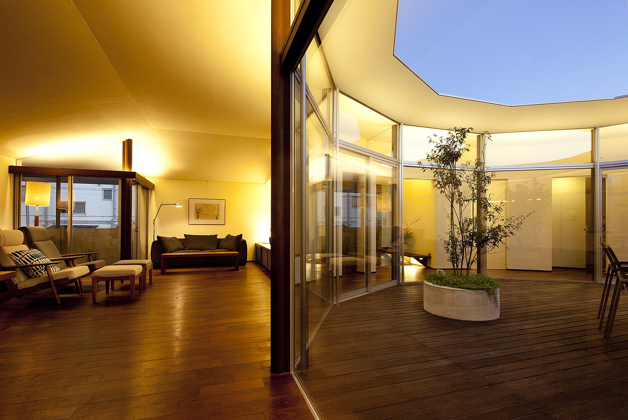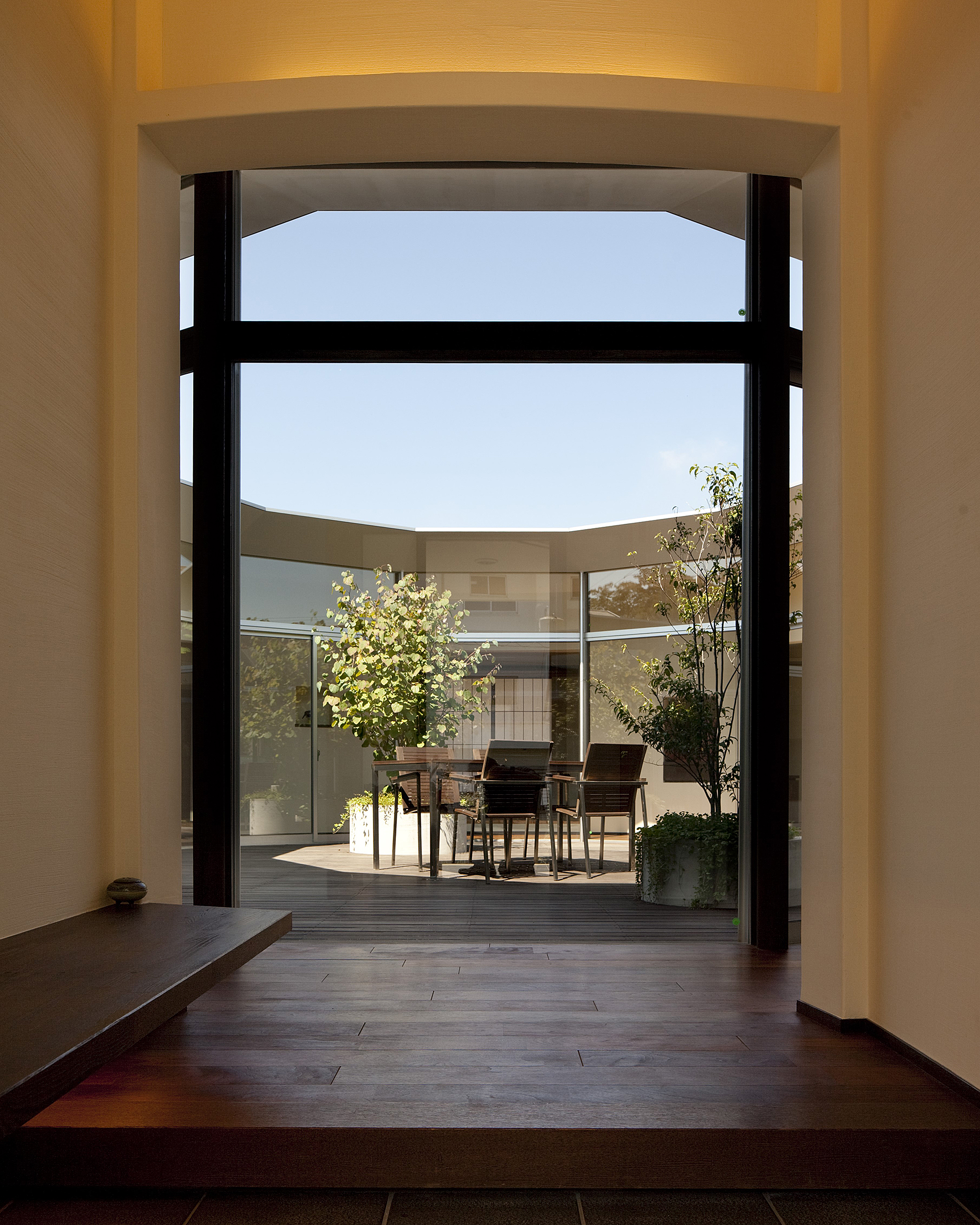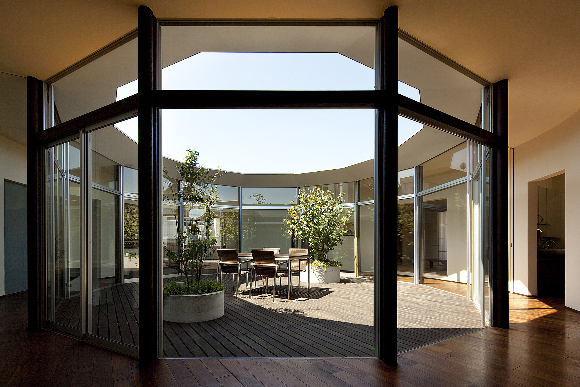 そこで出てきたのが、最も普遍的な形態である円と方形(四角)です。つまり、低い敷地の湿気や道路からの雨水の流入を回避するため、建物を持ち上げ、周辺からのプライバシイーを確保するため、方形の外周に部屋を配し、建物の中央にくり抜かれた大きな光の空洞の円周すべてを開口部としました。