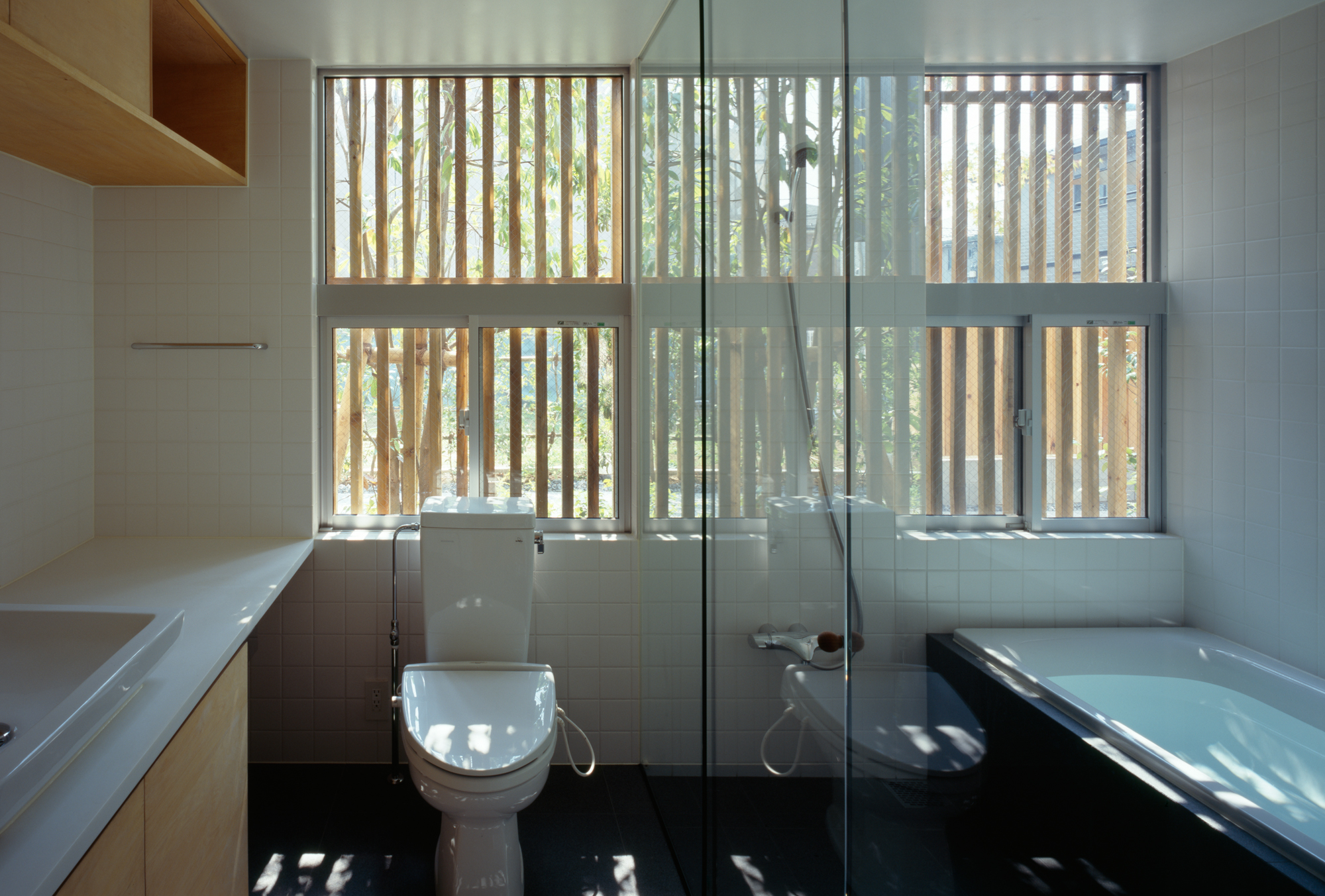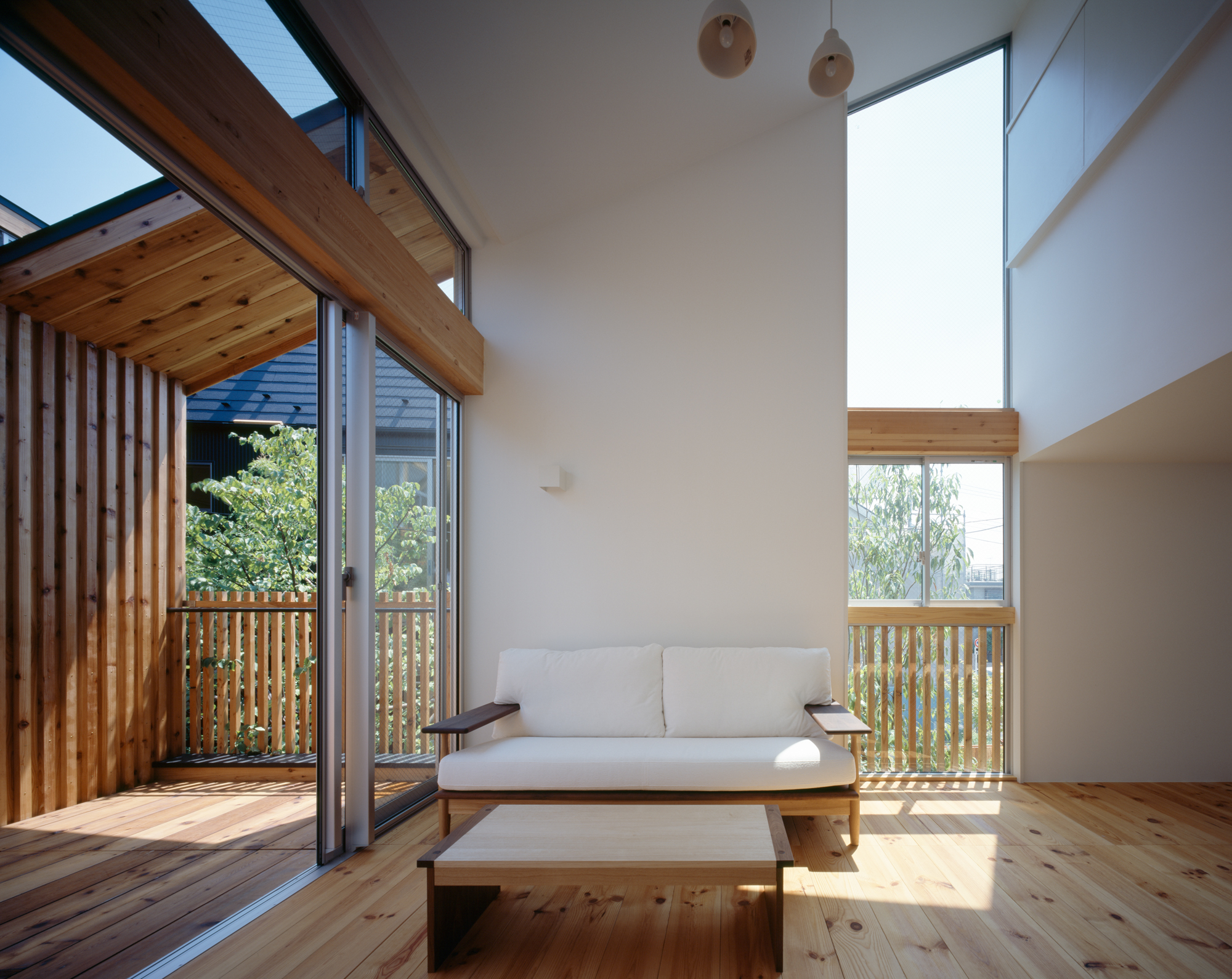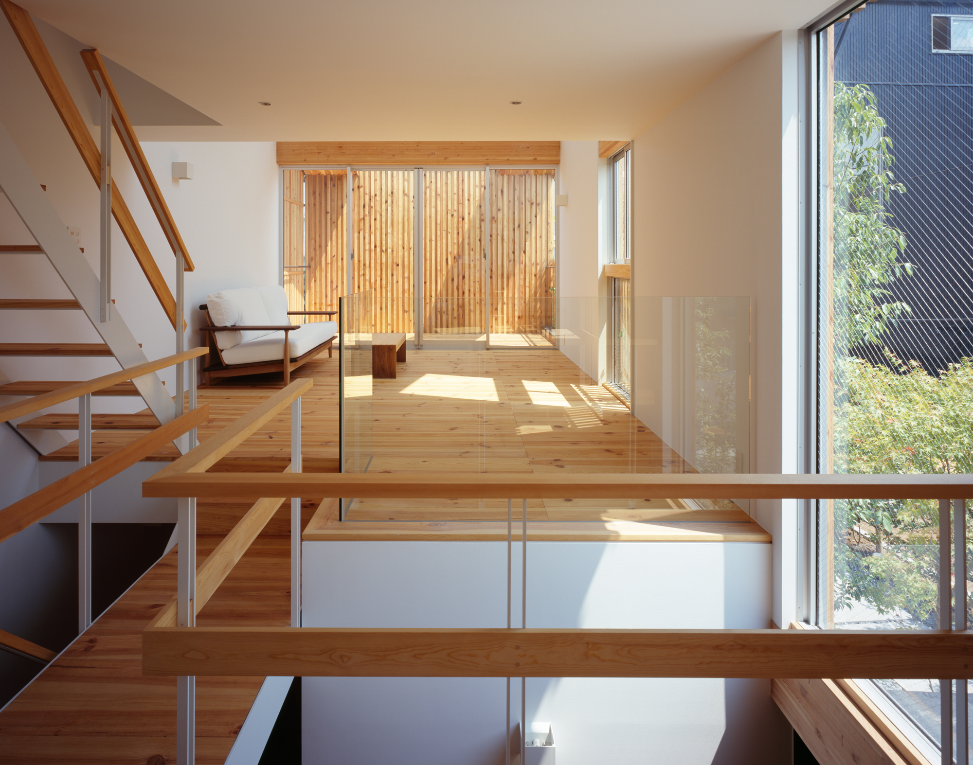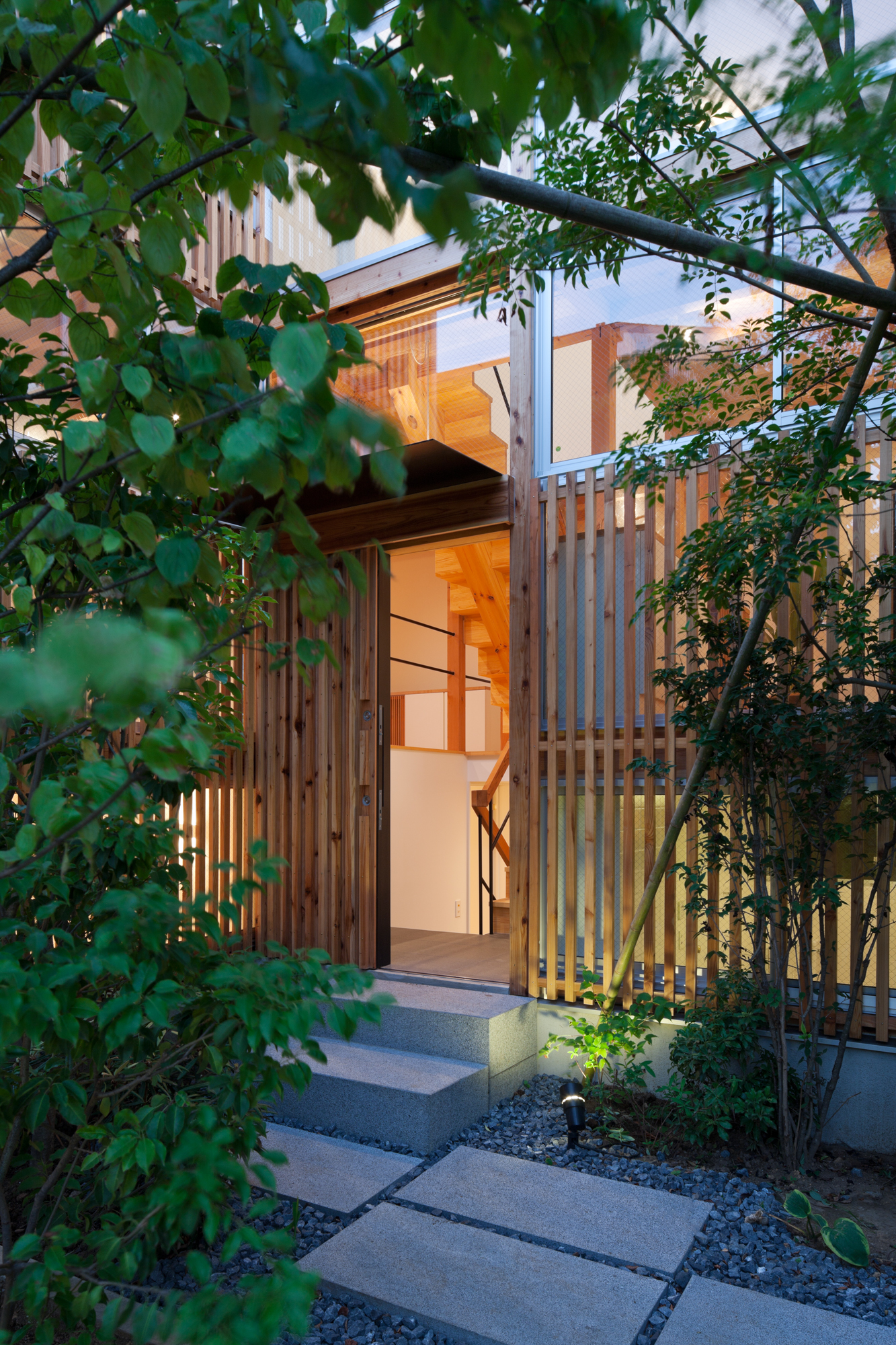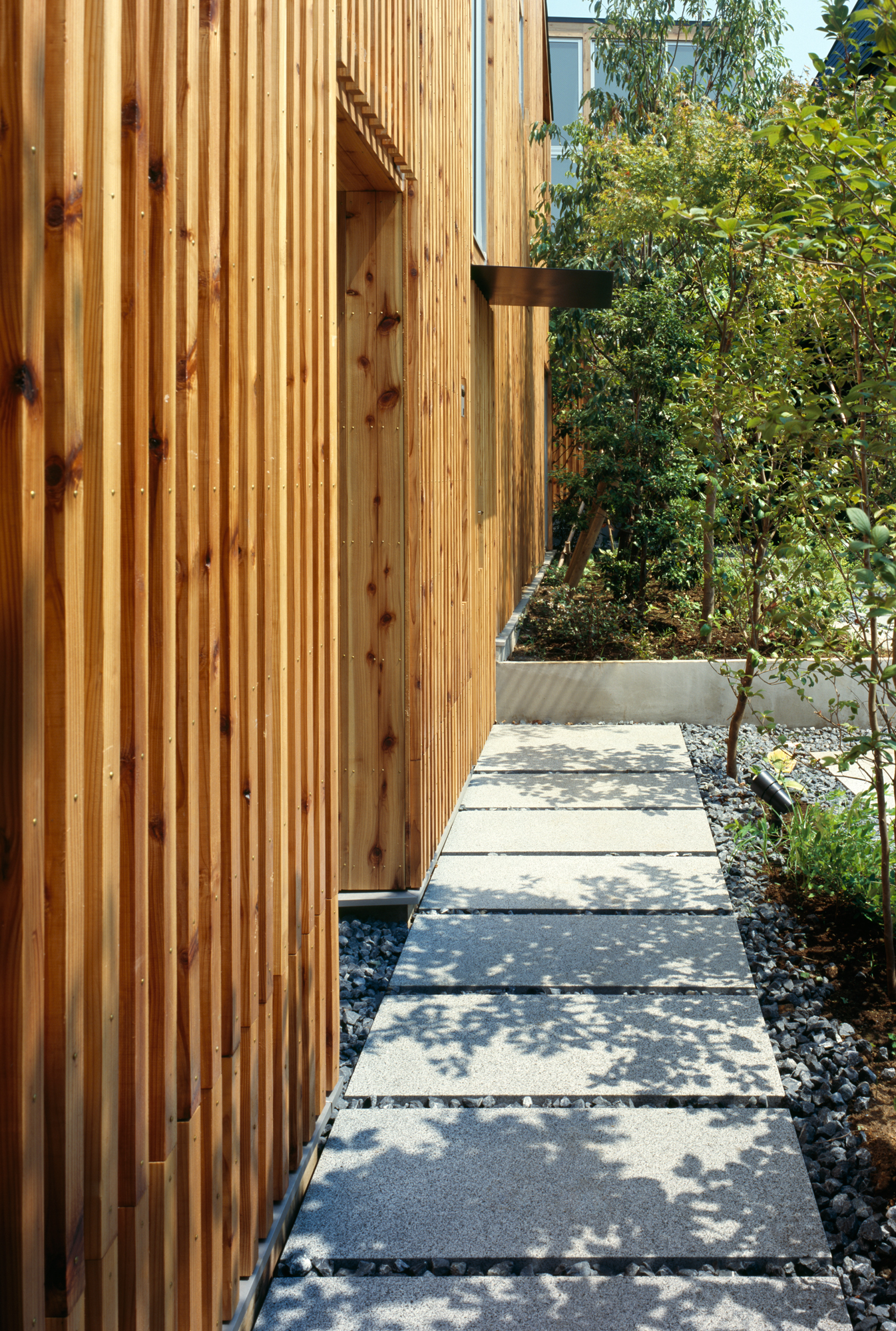 棲林居は不動産デベロッパーをクライアントとする建売住宅2棟の計画である。それぞれ約30坪の土地に1棟づつ計画することを求められたが、こうしたミニ開発を地域の連続的な風景を破壊するものではなく、むしろ修景として作用させるべく、60坪に2棟建てるような計画とした。防火規制をクリアしつつ、杉板張りの連続的な外壁を形成、それを背景として、敷地境界線をまたいで、まとまった庭を計画した。