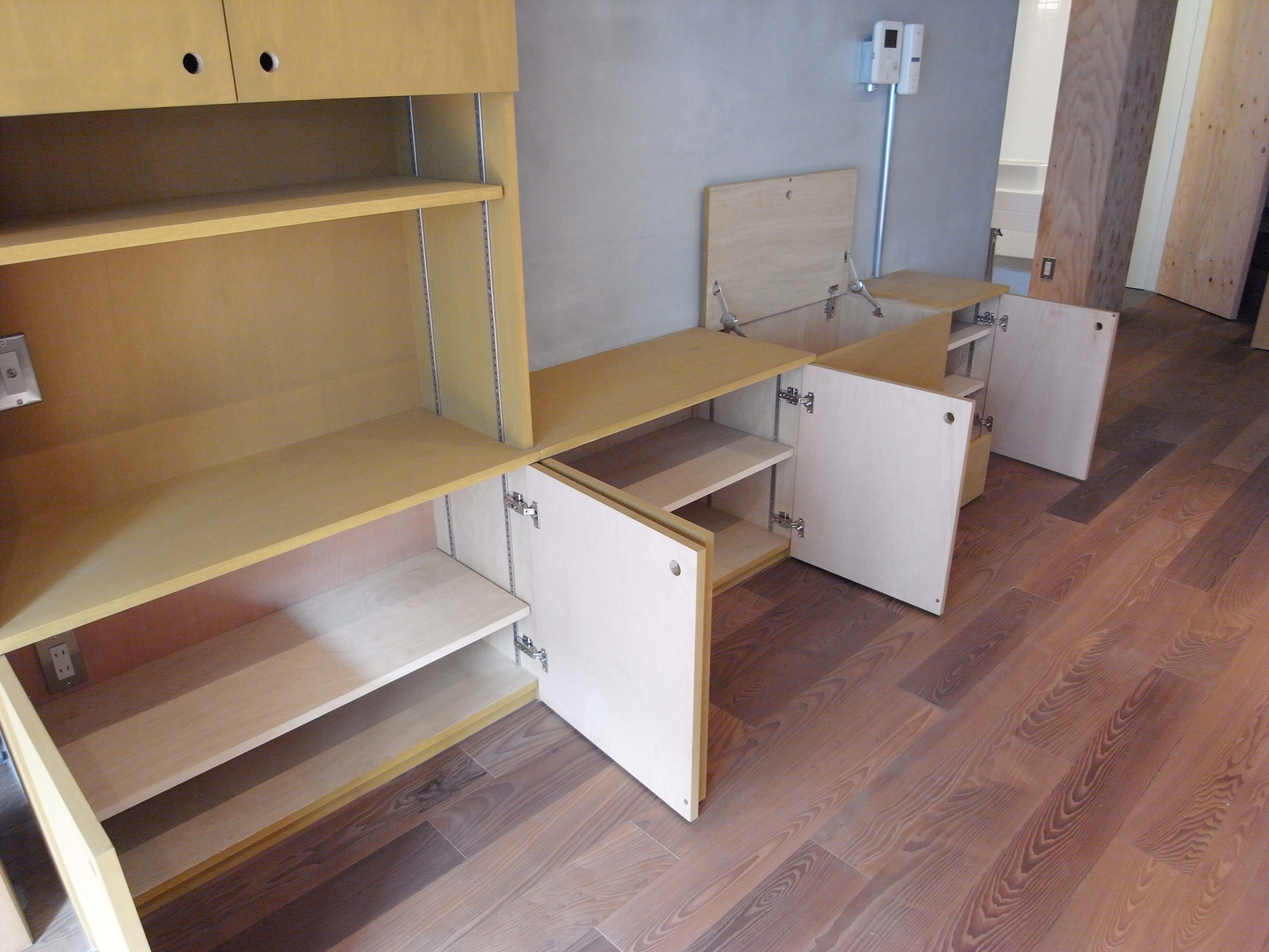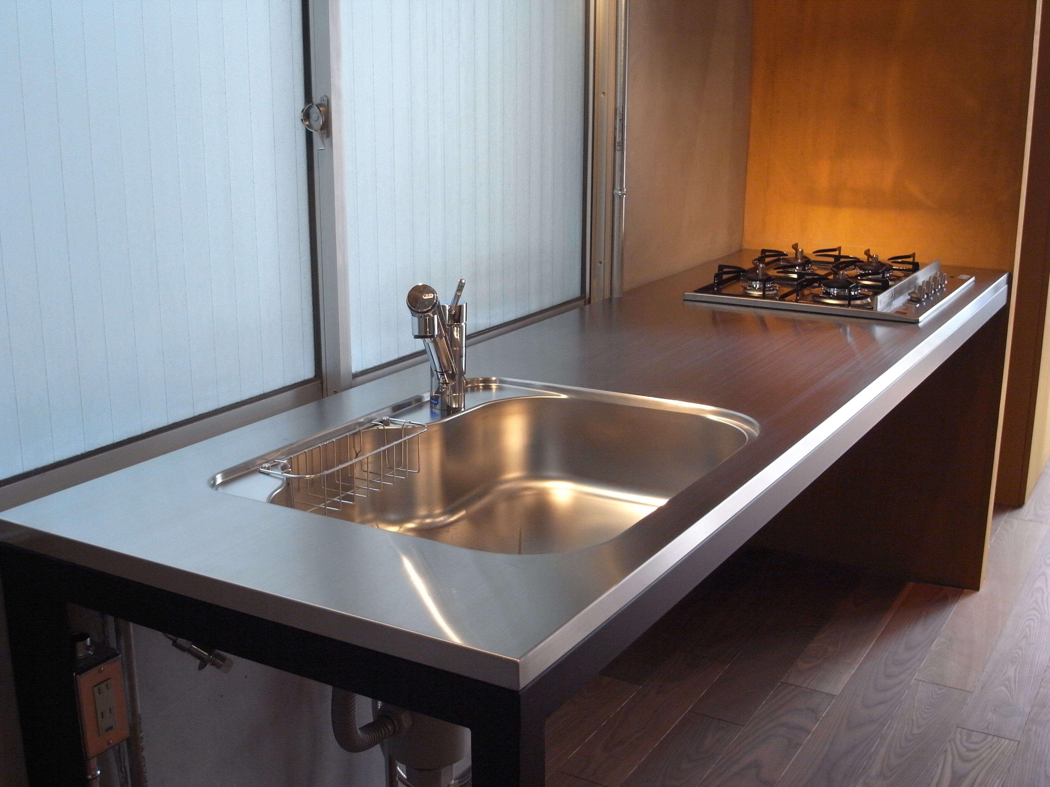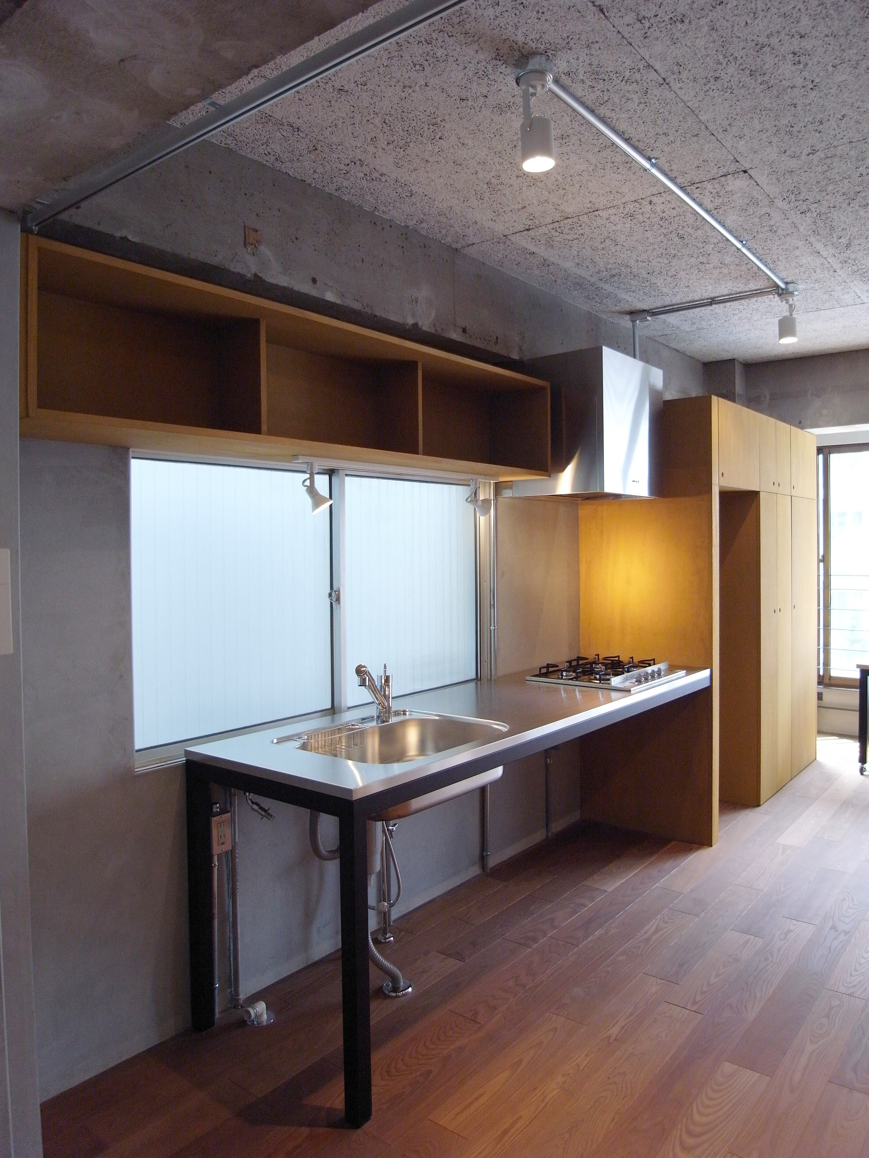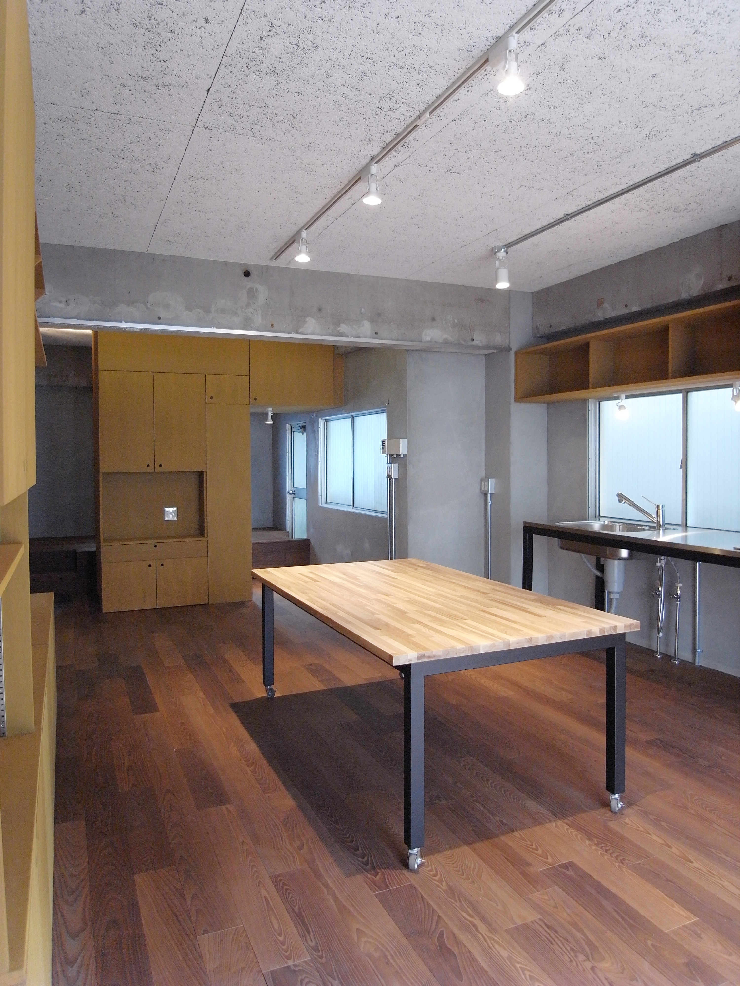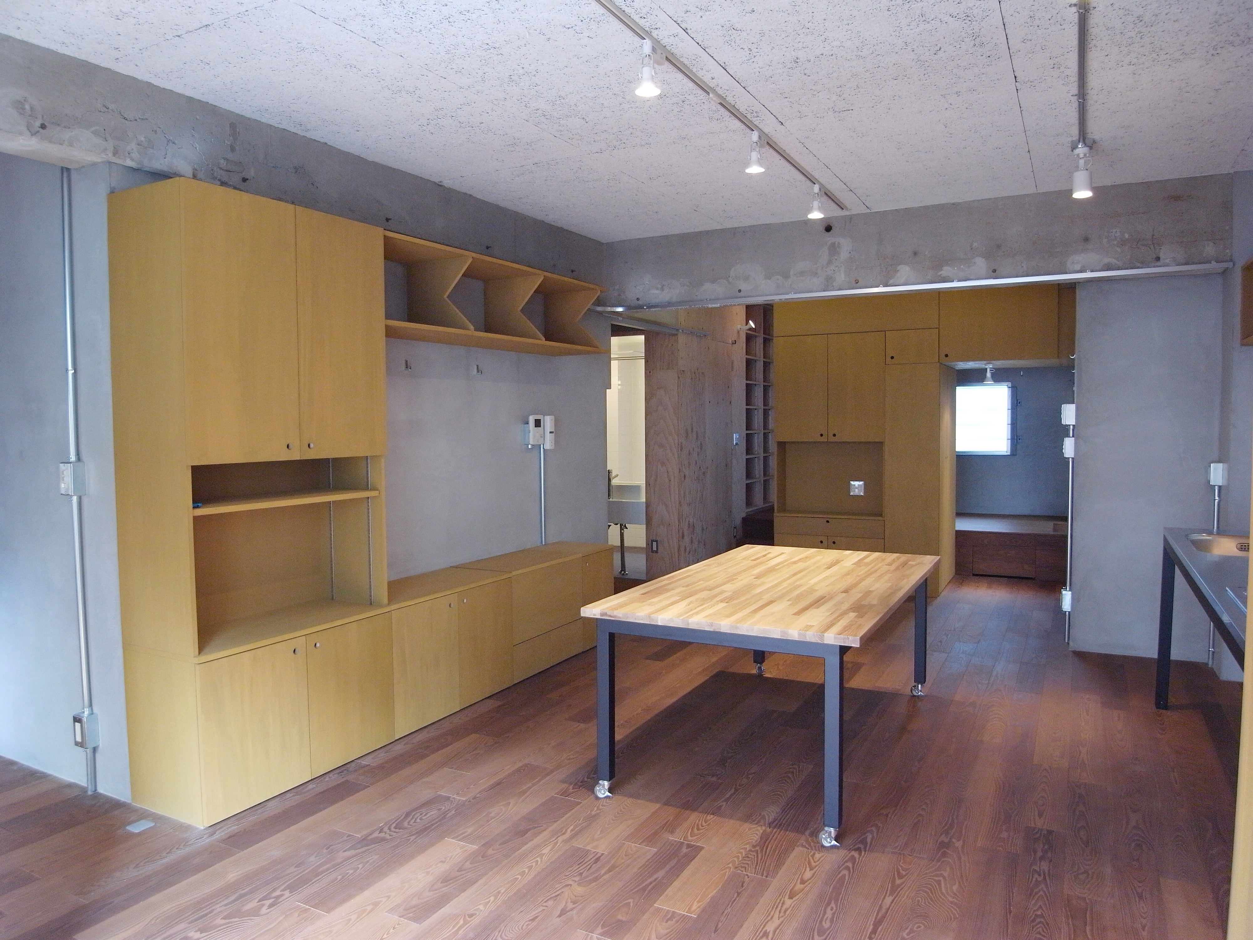収納には、エアコンやテレビ、ミシンなど、用途に合わせた場所を作り、キッチン周りは必要最小限の設備を備えたステンレス天板とスチールの足を製作。作業台となる大きなテーブルもキッチンに揃えて制作しています。