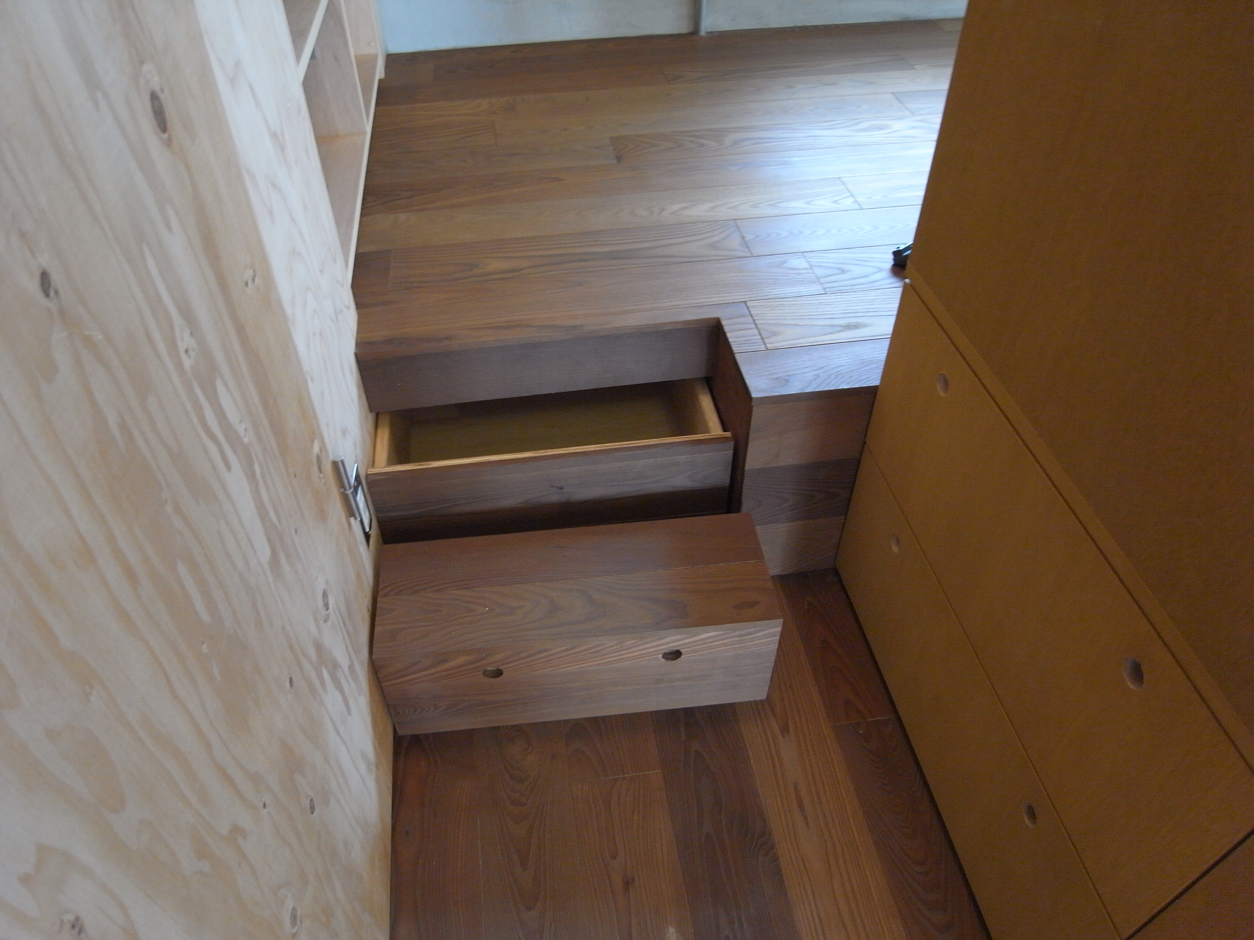 楽器、洋裁、読書など、多くのこだわりと楽しむ時間を大事にしながら、友と集う時間も楽しみたい施主の生活に合わせ、趣味や雑貨・家電などの全てを盛り込む収納セットで仕切ることで、自由に使える広い場所と、少し床レベルを上げたプライベートな時間を過ごすためのアルコーブを作りました。