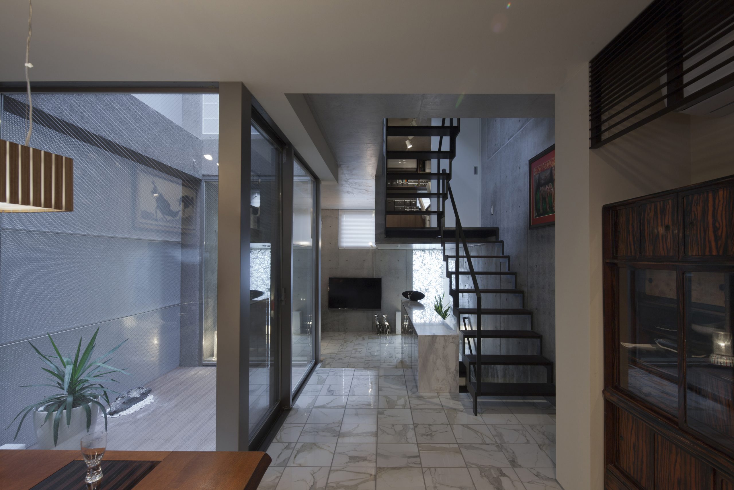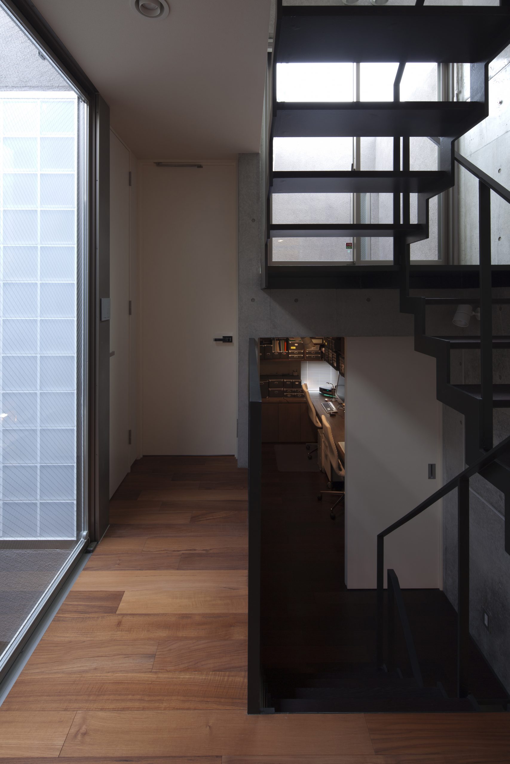 都市の宅地に多くみられる細長い形状の敷地に、2台分のガレージと中庭を配し、スキップフロアが各エリアを繋いでいくような構成としました。
