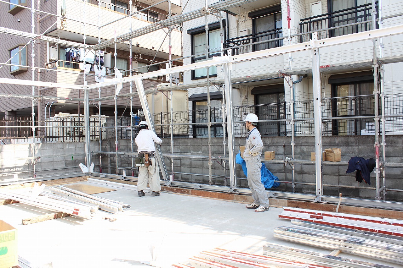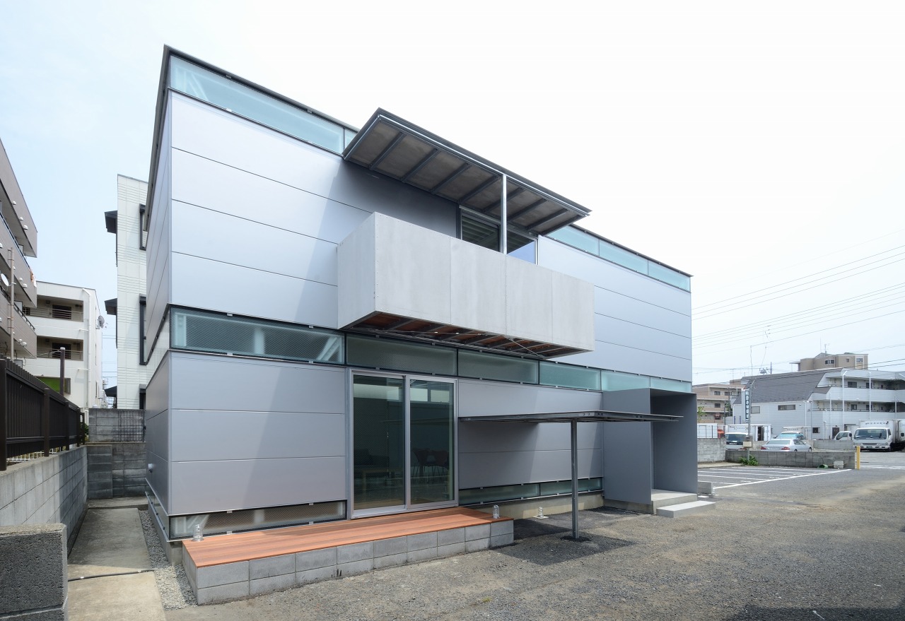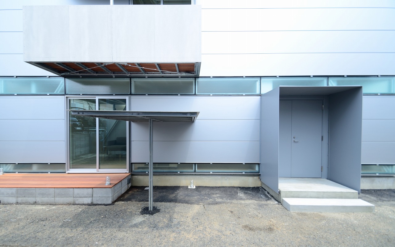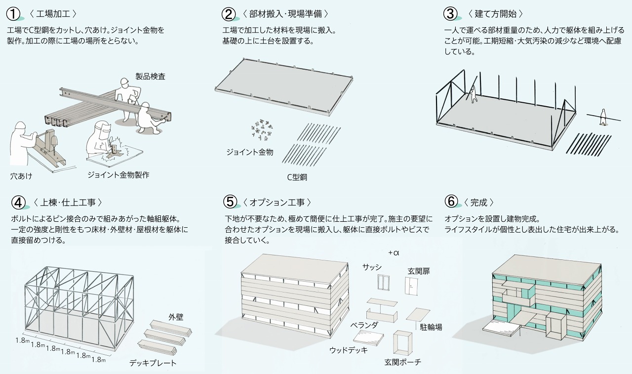 C形鋼のみで組みあがった鉄骨フレームに、一定の強度と剛性を持つ床材と外壁材・ 屋根材を躯体に直接留めつけるため、下地は不要となり、きわめて簡便に仕上工事が 完了する。鉄骨フレームについてはあらわしとし、”見せるディテール”を心がけた。 最後に、庇やバルコニー等を施主の要望に合わせてオプションとして用意し、それらを 躯体に直接ボルトやビスで接合していき、結果としてオプションが施主のライフスタ イルを表し、個性として表出した住宅が出来上がっている。