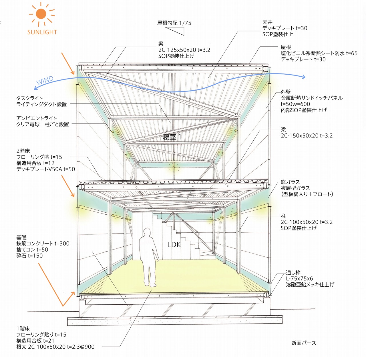 なお、本プロジェクトは特殊鉄骨造を数多く手がけてきた鉄骨ファブより依頼を受けて 始まったプロジェクトであり、今後鉄骨ファブと共に「LGS HOUSE」として展開して いく為のプロトタイプとして位置づけられている。